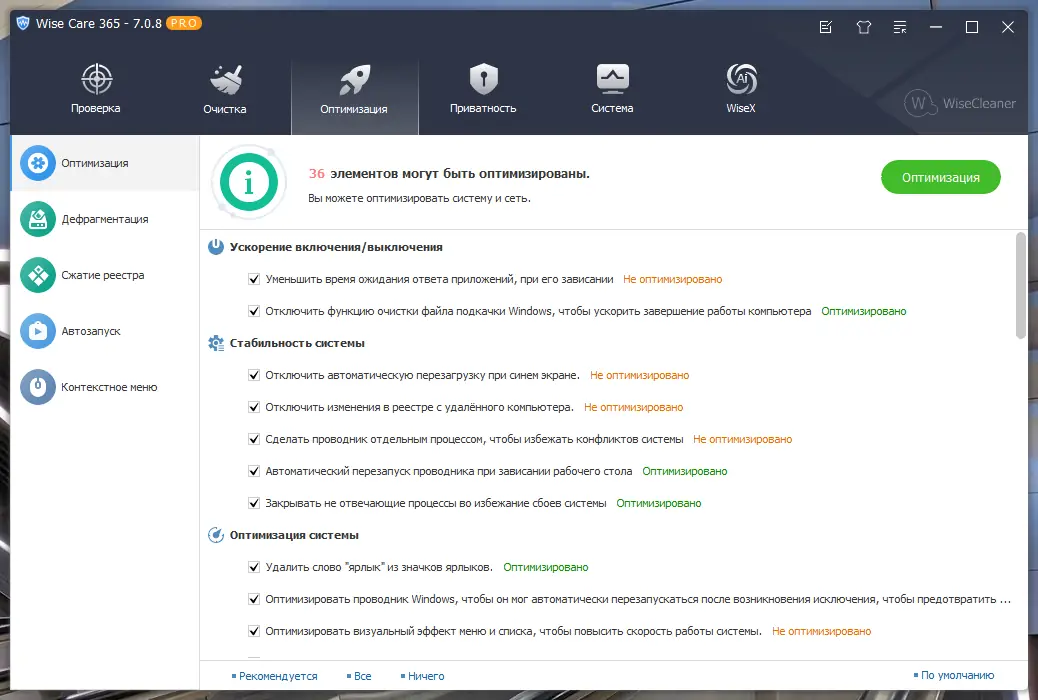 Wise Care 365 – это программный пакет, предназначенный для комплексной оптимизации работы ПК. Он быстро и безопасно очищает системный реестр, освобождает место на дисках, дефрагментирует файлы и реестр, восстанавливает удалённые данные. Также осуществляется блокировка приложений с помощью пароля, оптимизация оперативной памяти, управление автозагрузкой и многое другое. Программа включает дополнительные опции по скрытию, шифрованию важной информации и выполнять задачи в автоматическом режиме — «в один клик» или по расписанию, что существенно облегчает уход за компьютером.