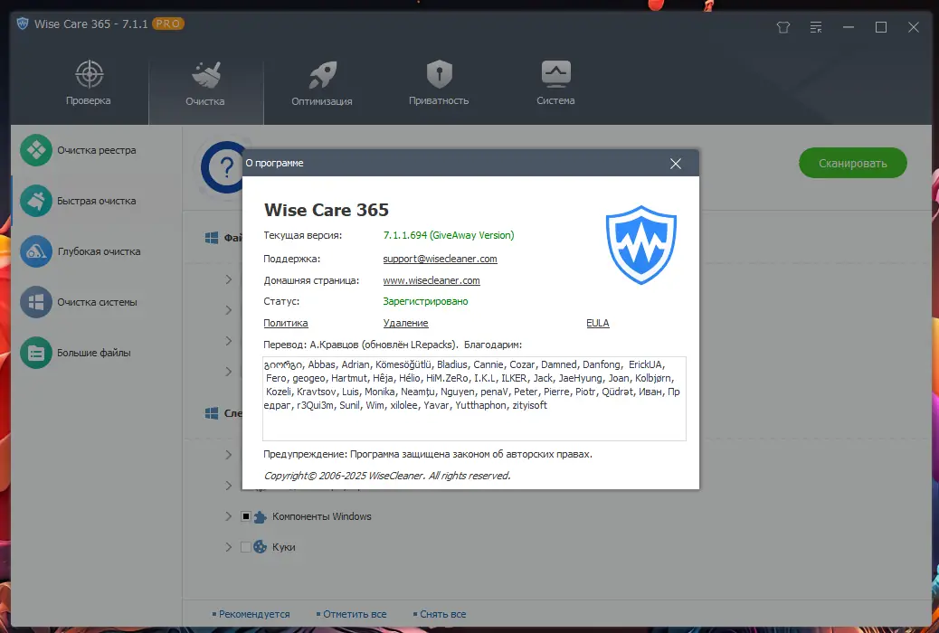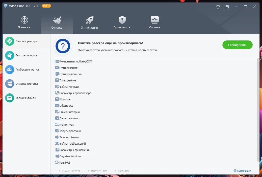 Wise Care 365 — профессиональный инструмент для оптимизации и обслуживания компьютера с операционной системой Windows. Он способен бесплатно или за небольшую плату произвести глубокую очистку системного реестра, освободить место на диске, дефрагментировать жесткий диск и реестр, а также восстановить удалённые файлы. Программа позволяет блокировать запуск нежелательных приложений с помощью пароля, управлять автозапуском, оптимизировать оперативную память и выполнять множество других задач по поддержанию высокой производительности системы. Дополнительные опции включают скрытие и шифрование данных, настройку быстрого режима «в один клик» и автоматизированное выполнение задач по расписанию.