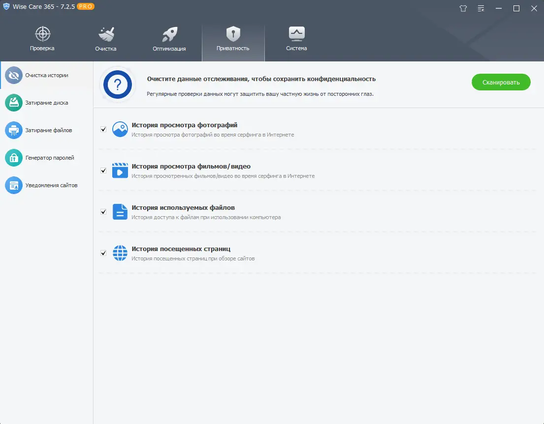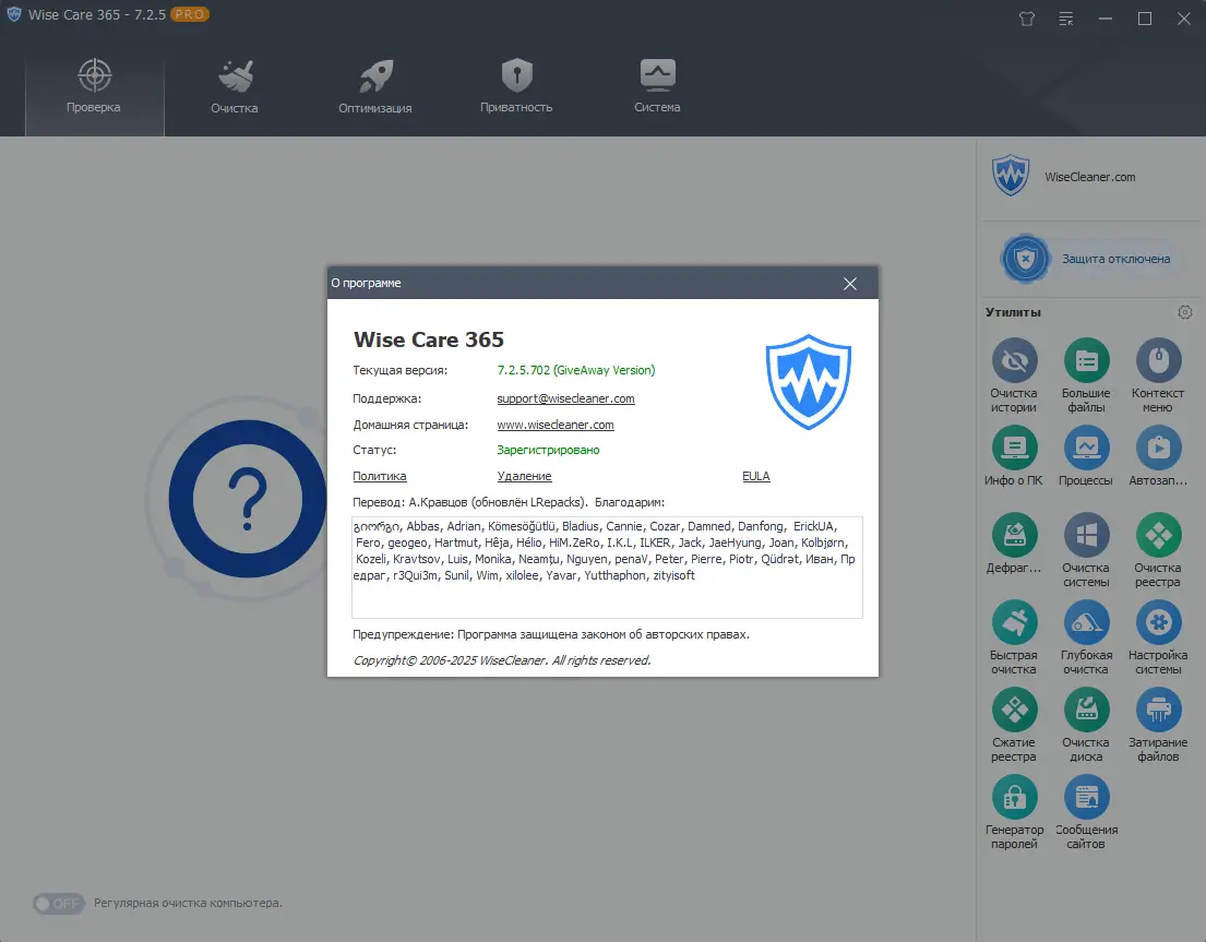 Wise Care 365 – это мощный программный комплекс, предназначенный для быстрого и безопасного улучшения работы компьютера. Он позволяет проводить очистку системного реестра, освобождать место на жестком диске, дефрагментировать файлы и реестр, а также восстанавливать удалённые данные. Кроме того, программа обеспечивает блокировку приложений с паролем, настройку оперативной памяти и управление автозагрузкой, что значительно повышает производительность системы. В комплект входит функционал скрытия и шифрования важных файлов или папок, а также возможность автоматического выполнения задач по расписанию или в один клик, что делает её универсальным инструментом для пользователей разного уровня.