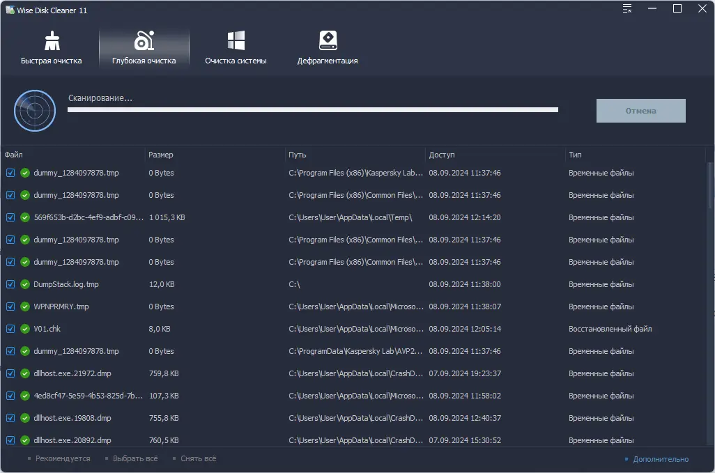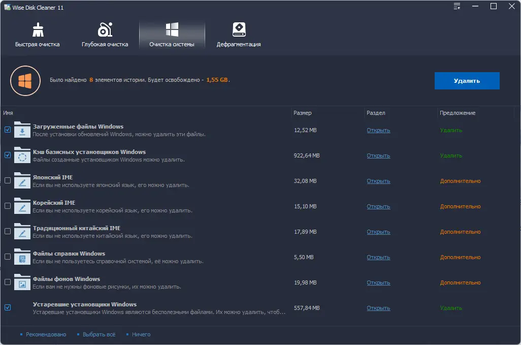 - Обнаружение и удаление временных, ненужных, и мусорных файлов на жестком диске.