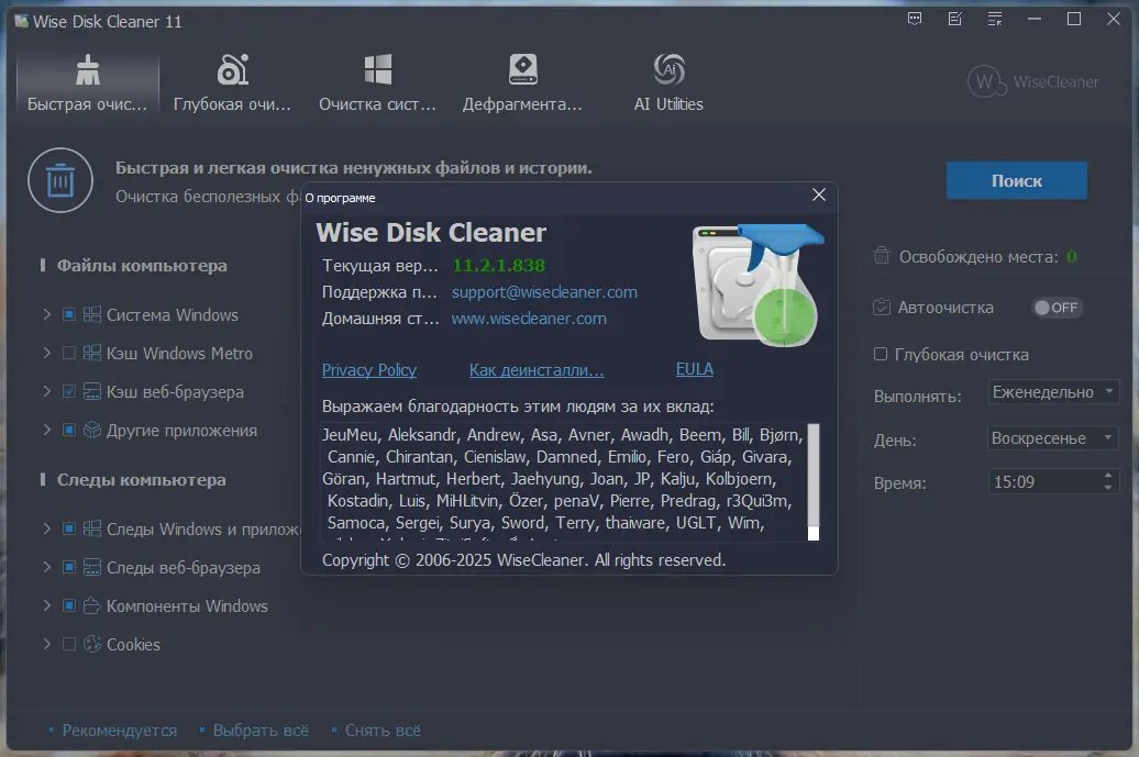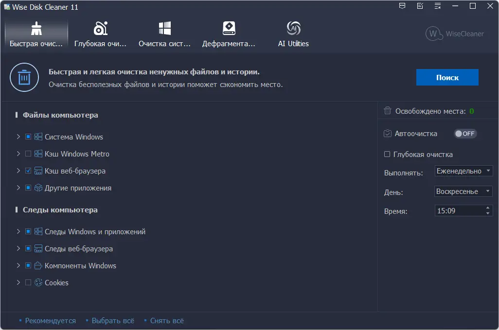 Быстрая, удобная и простая в использовании утилита для очистки жестких дисков от ненужных и временных файлов, которая помогает ускорить работу системы и освободить место на диске.