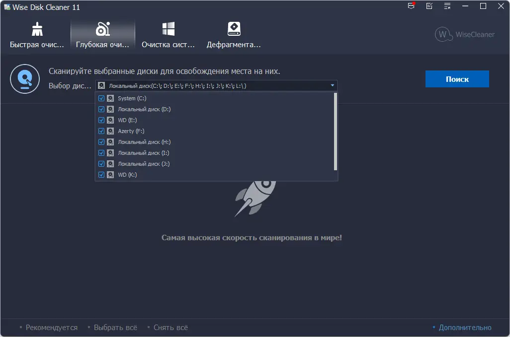 - Быстрое сканирование жестких дисков на наличие ненужных и временных файлов.