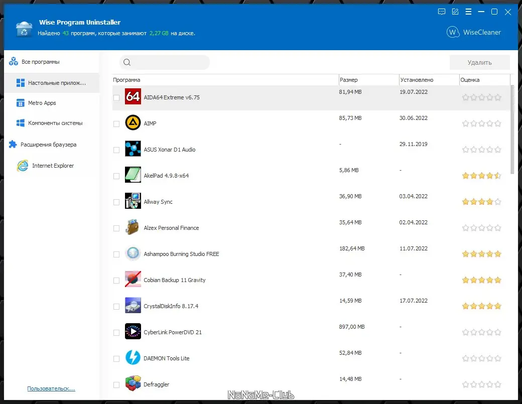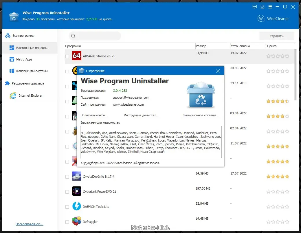 Wise Program Uninstaller — универсальная утилита для удаления установленных программ с компьютера. Обеспечивает комплексное удаление как стандартными средствами системы, так и собственными инструментами, включая очистку остаточных файлов и записей в реестре, а также удобный поиск информации о приложениях.