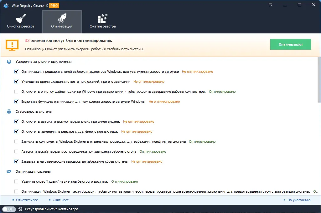 Wise Registry Cleaner — это современная программа для безопасной очистки реестра Windows. Она полностью устраняет ошибочную и устаревшую информацию, собирающуюся в системе с течением времени, что способствует значительному увеличению скорости работы операционной системы. Все найденные проблемы можно просмотреть и оценить их описание перед автоматической или ручной корректировкой. Помимо этого, программа сохраняет резервные копии изменений, что позволяет быстро восстановить исходное состояние реестра в случае необходимости.