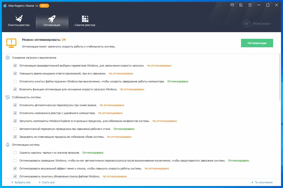 - Оптимизация параметров реестра для ускорения загрузки, повышения стабильности и производительности системы.