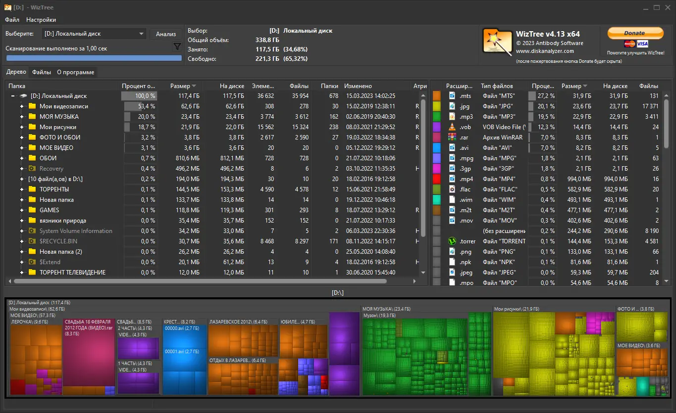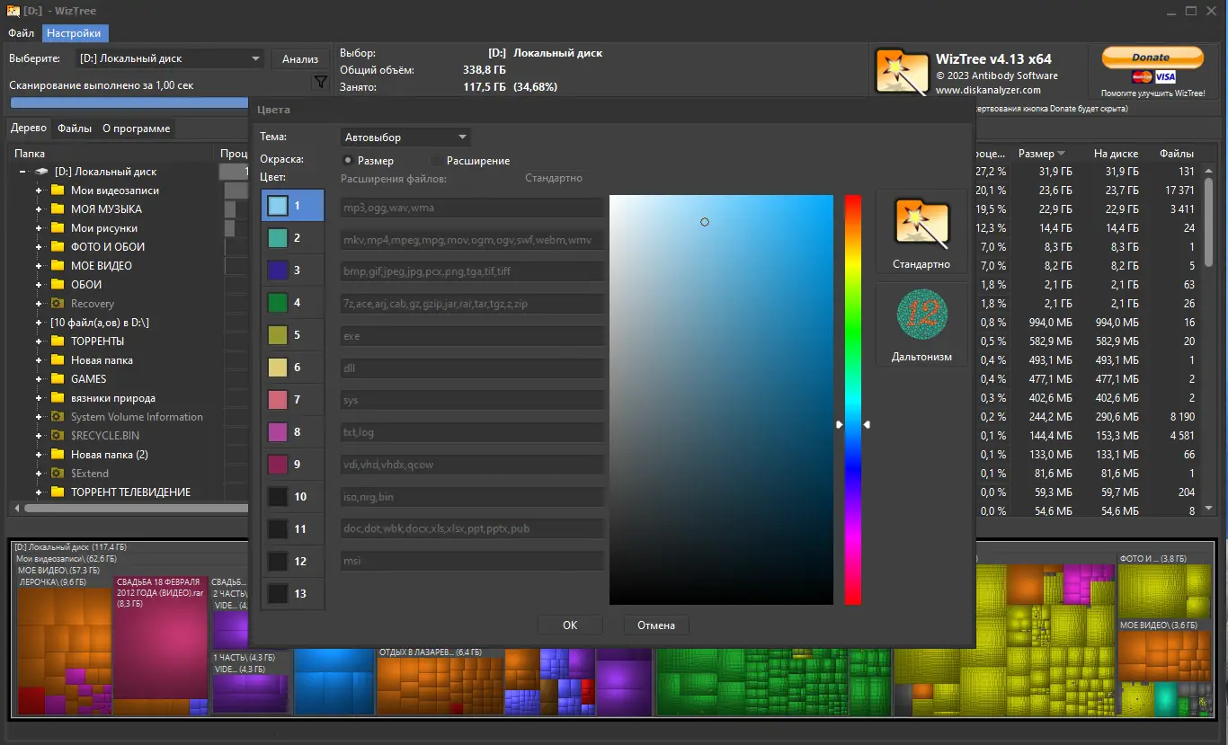 - Отображение результатов в виде визуальной тепловой карты (Treemap), позволяющей сразу увидеть большие файлы и их расположение;