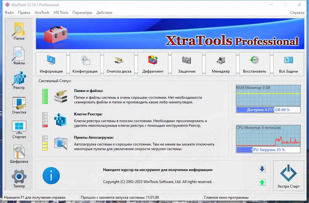 XtraTools — это мощный набор средств для повышения производительности и надежности операционной системы Windows. Он заботится о каждом элементе вашего компьютера: от оптимизации реестра и управления автозагрузкой до очистки временных файлов и шифрования данных. Интуитивно понятный интерфейс позволяет легко настроить работу системы, контролировать использование памяти и выполнять системные настройки для достижения максимальной скорости и стабильности. Особенно полезен для пользователей, желающих повысить безопасность и эффективность работы на PC с любыми версиями Windows 7, 8/8.1, 10 или 11, как на 32-битных, так и на 64-битных версиях.