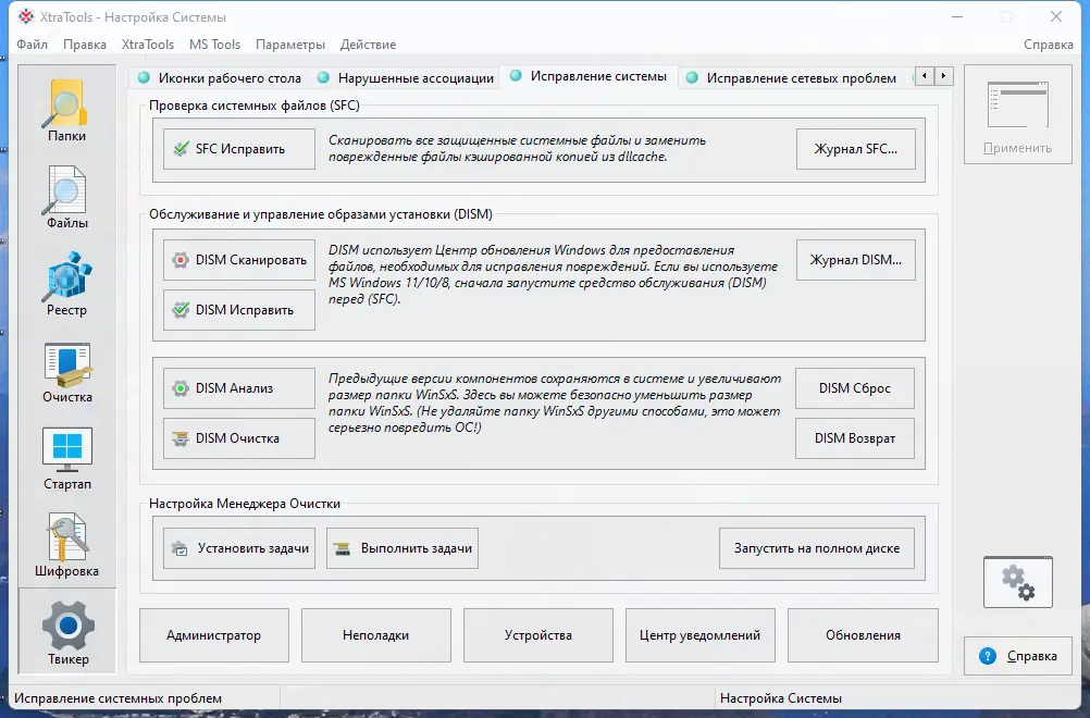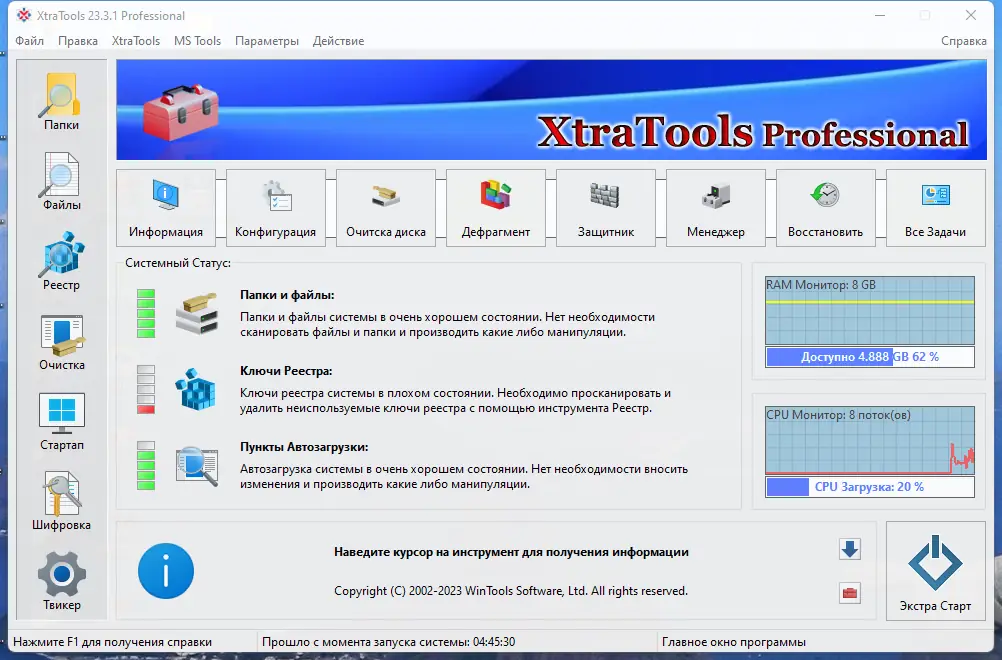 XtraTools — это универсальный инструмент для оптимизации системы MS Windows, обеспечивающий полный контроль над состоянием вашего компьютера и его настройками. Платформа подходит для различных вариантов использования и подходит как для профессионалов, так и для обычных пользователей, стремящихся повысить производительность и безопасность системы.