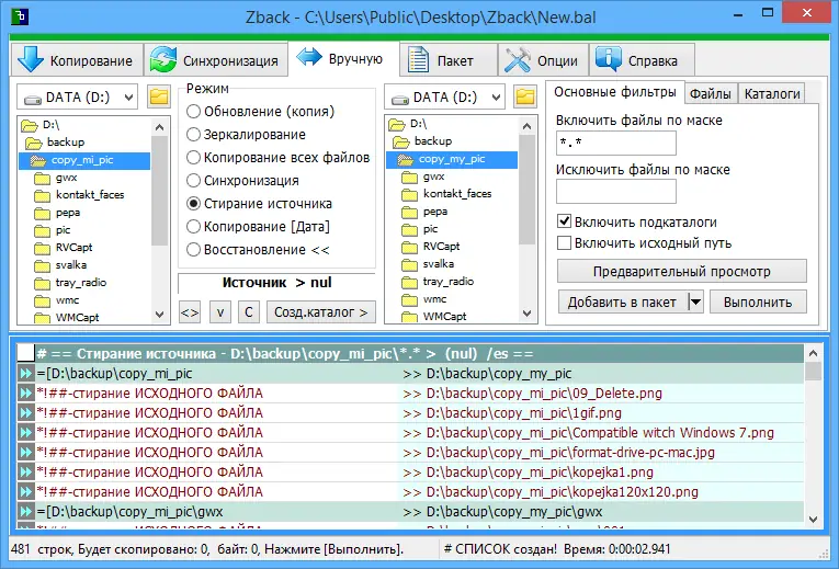 - Режимы: обновление, зеркалирование, синхронизация, резервное копирование и восстановление;