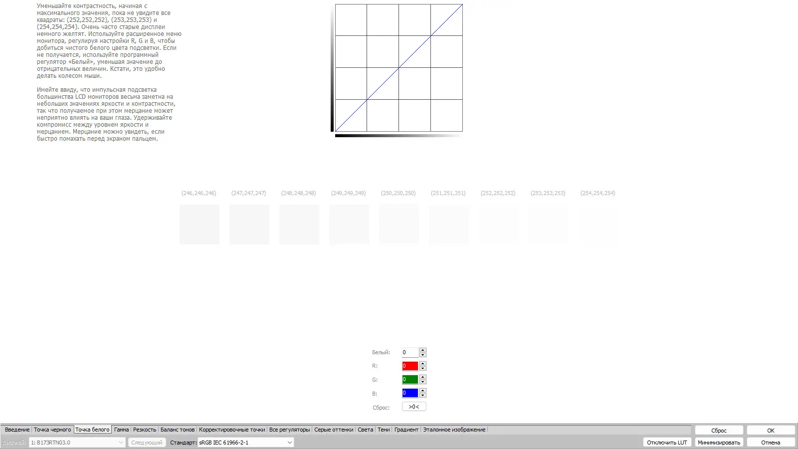 - Выбор цветового пространства — обычно sRGB или по установкам монитора
