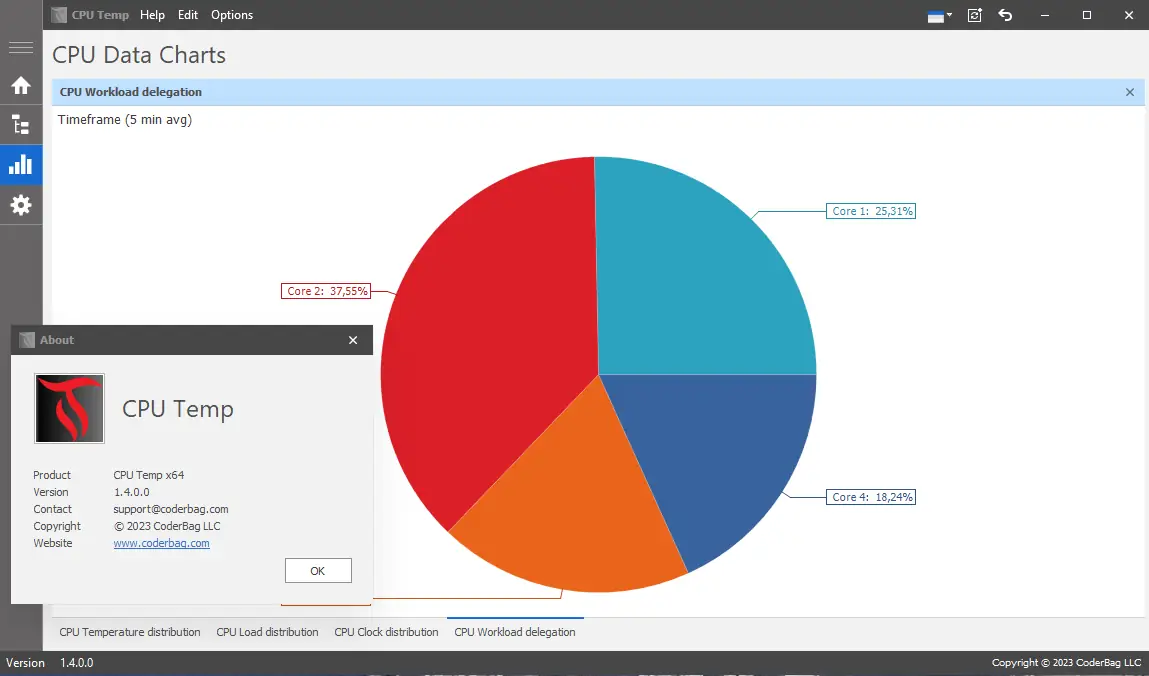 Программа выделяется понятным и интуитивно понятным интерфейсом, обеспечивающим быстрый доступ к ключевым параметрам. Основной вид приложения включает графики, плитки с текущими показателями и сводную информацию о процессоре. Пользователи могут переключаться между различными метриками, такими как температура, загрузка, тактовая частота, мощность и напряжение. Встроенная цветовая схема теплового индикатора помогает быстро определить зону рабочей температуры, предупреждая о возможных перегревах и критических ситуациях. Также реализовано экспортирование данных в популярные форматы и просмотр исторических графиков за выбранный период, что способствует более точному мониторингу и аналитике состояния системы.