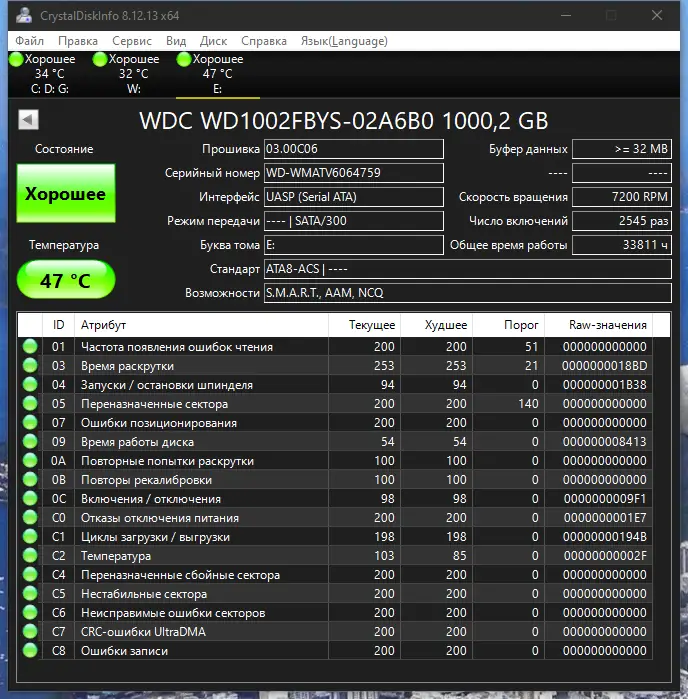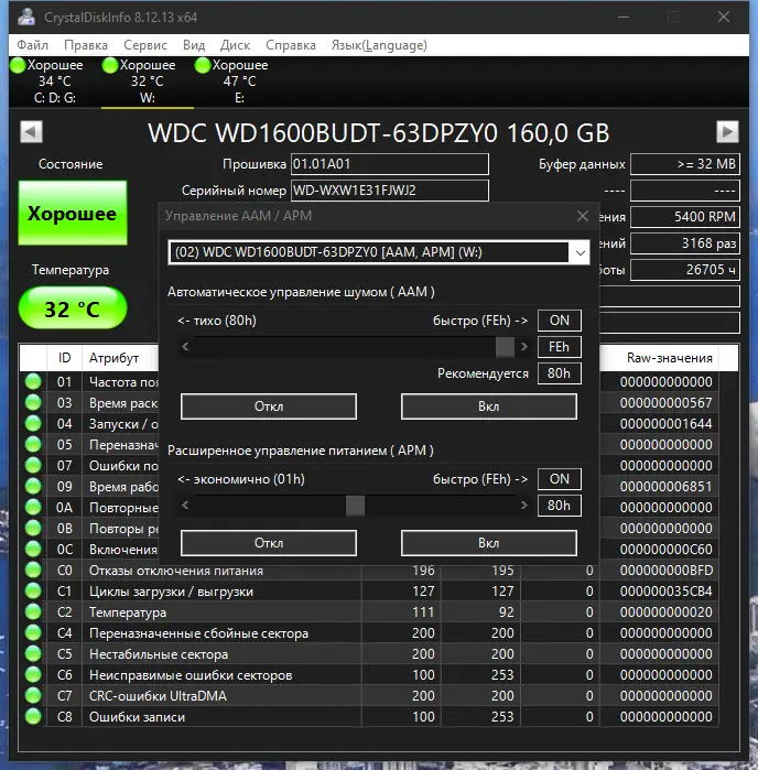 CrystalDiskInfo — это универсальный инструмент, предназначенный для отслеживания состояния и здоровья жестких дисков и SSD, поддерживающих технологию S.M.A.R.T. Программа позволяет не только производить мониторинг параметров устройств, но и отображать их в удобной графической форме, а также получать детальную информацию о каждом накопителе, такую как прошивка, серийный номер, стандарт и интерфейс. Особенностью является возможность управления настройками AAM и APM для внешних устройств и поддержки внешних накопителей с интерфейсами USB и IEEE 1394. Программа совместима с Windows 7, 8/8.1, 10 и 11, работает как в 32-, так и в 64-битных версиях системы, и предлагает локализацию на русском языке для удобства пользователей.