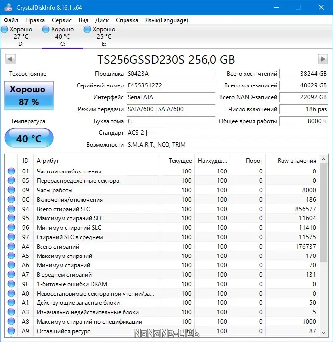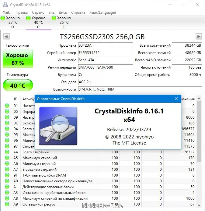 CrystalDiskInfo — это мощный инструмент, который отслеживает параметры работы жестких дисков и SSD с поддержкой технологии S.M.A.R.T. Он предоставляет подробную информацию о прошивке, серийном номере, интерфейсе и общем времени работы каждого устройства в системе. Программа демонстрирует атрибуты, связанные с состоянием диска, такие как ошибки чтения, производительность, циклы включения-выключения и наличие ошибок секторов. Поддержка локализаций, сменные темы и динамическое отслеживание параметров делают использование удобным и наглядным. Также имеется возможность для внешних накопителей через USB и IEEE 1394, а управление настройками AAM и APM доступно для внешних устройств.