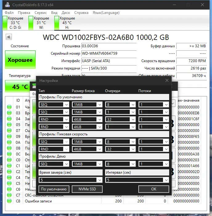 - Предупреждение о возможных неисправностях на основе анализа атрибутов S.M.A.R.T.;