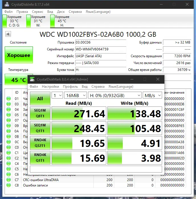 CrystalDiskInfo — бесплатная утилита для мониторинга состояния жестких дисков и SSD с поддержкой технологии S.M.A.R.T. Она позволяет отслеживать важные параметры устройств, определять их текущий статус и своевременно предупреждать о возможных проблемах. Программа обеспечивает подробную информацию о каждом подключенном накопителе, включая версию прошивки, серийный номер, интерфейс, общее время работы и параметры диагностики.