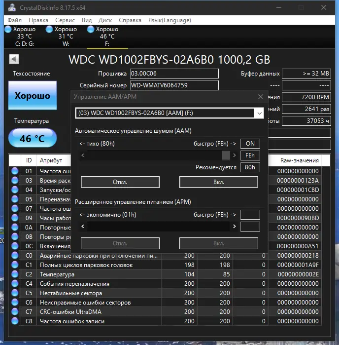 CrystalDiskInfo — это надежное программное обеспечение, предназначенное для отслеживания состояния жестких дисков и SSD, поддерживающих технологию S.M.A.R.T. Оно обеспечивает подробный мониторинг параметров работы устройства, включая температуру, ошибки, количество включений и другие важные показатели. Программа поддерживает разные языковые интерфейсы, сменные темы и динамически отображает изменения параметров для всех подключенных накопителей, включая внешние устройства через USB и IEEE 1394.