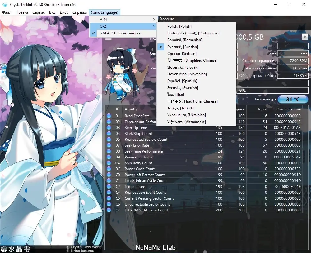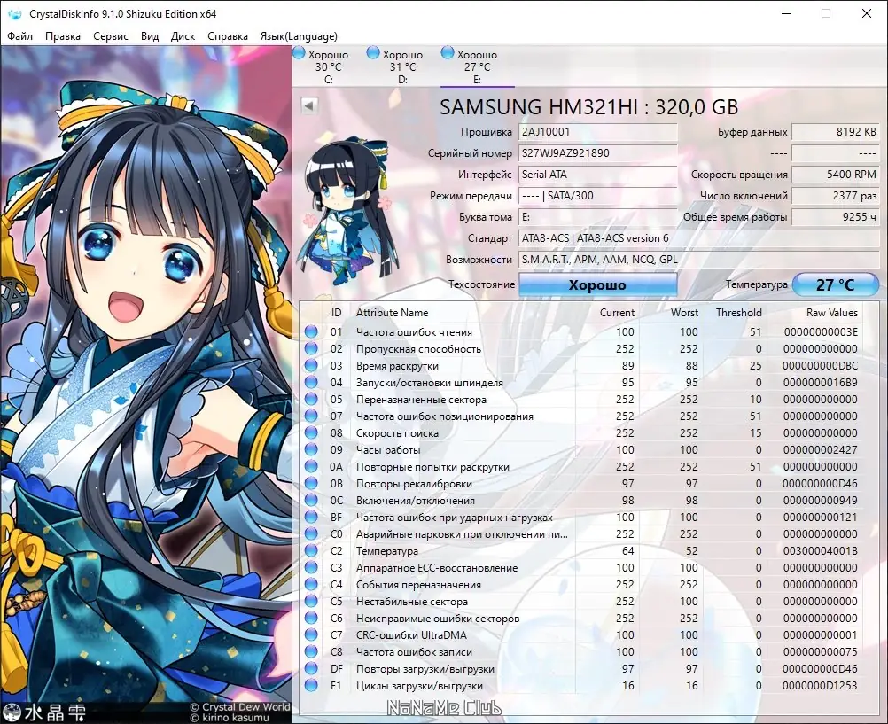 CrystalDiskInfo — это бесплатное средство для мониторинга состояния жестких дисков и SSD, поддерживающих технологию S.M.A.R.T. Оно позволяет отслеживать параметры накопителей, их температуру, а также производит детальный анализ текущего состояния. Программа обеспечивает визуальное отображение информации о прошивке, серийном номере, стандартных характеристиках и интерфейсе устройства, а также отображает важные показатели атрибутов системы самодиагностики S.M.A.R.T., такие как ошибки чтения, производительность и количество циклов включения-выключения. Поддерживается локализация на русском языке, сменные темы оформления и возможность динамического отслеживания изменений параметров для всех подключенных накопителей. Особенно удобно для пользователей, желающих как проверить состояние обычных HDD, так и SSD, а также внешних устройств через USB или IEEE 1394.