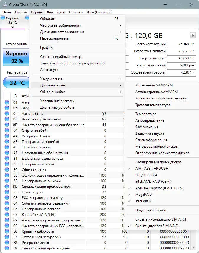 CrystalDiskInfo — бесплатная программа для мониторинга состояния жестких дисков и SSD, поддерживающая технологии S.M.A.R.T., позволяющая быстро и удобно отслеживать здоровье и параметры накопителей прямо на русском языке.