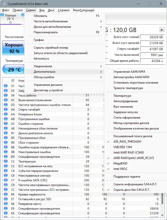 - Полная информация о состоянии дисков и возможностях управления AAM/APM;
