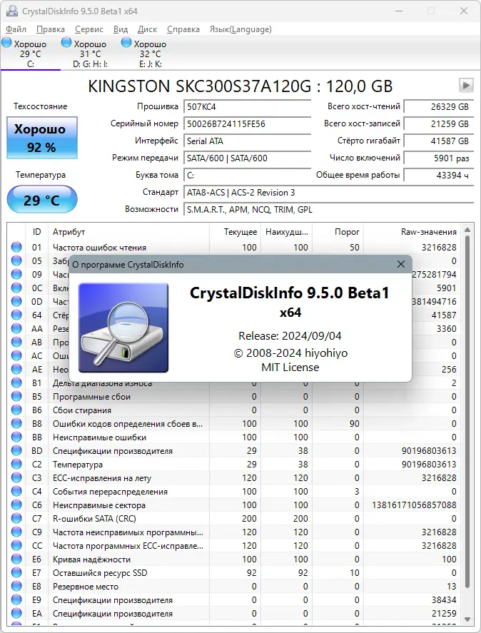 CrystalDiskInfo — это мощный инструмент, предназначенный для отслеживания состояния жестких дисков и твердотельных накопителей, поддерживающих технологию S.M.A.R.T. Он позволяет получать полноценную информацию о каждом диске, включая прошивку, серийный номер, интерфейс, общее время работы и другие параметры. Программа обеспечивает мониторинг температуры, ошибок чтения, циклов включения-выключения и других атрибутов системы самодиагностики. Поддержка внешних USB и IEEE 1394 устройств, сменные темы, локализация на русском языке и динамическое отслеживание изменений делают этот софт удобным и многофункциональным решением для пользователей различных версий Windows, включая Windows 7, 8/8.1, 10 и 11, как на 32-, так и на 64-битных системах.