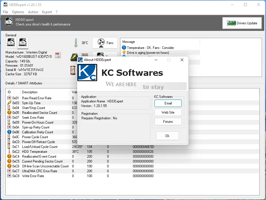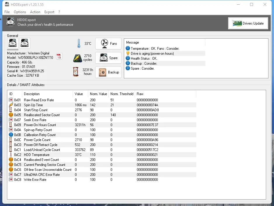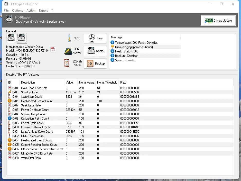 HDDExpert дает вам кристально четкое представление о здоровье и производительности вашего жесткого диска (HDD или SSD) и переводит S.M.A.R.T. атрибуты в удобочитаемую индикацию. С помощью этой программы легко понять состояние диска, выявить возможные сбои и принять меры по техническому обслуживанию. Инструмент способен классифицировать атрибуты S.M.A.R.T. по таким категориям, как отказы, температура, производительность и здоровье устройства, что помогает оценить комплексное состояние накопителя.