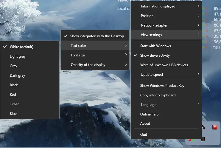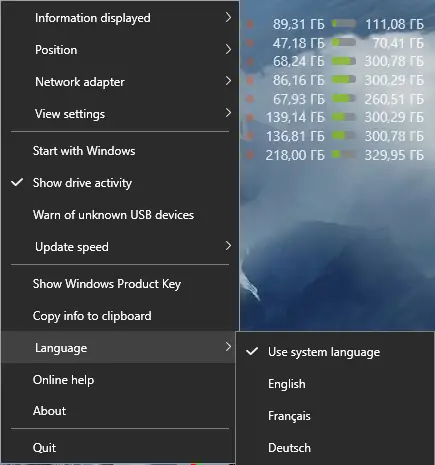 Программа осуществляет отображение ключевой информации о системе, такой как версия операционной системы, сетевые параметры, характеристики центрального процессора, видеокарты и оперативной памяти, а также объем данных на дисках. В настройках можно изменять цвет, размер шрифта, уровень прозрачности и частоту обновления информации, что обеспечивает комфортное восприятие данных и их своевременное обновление.