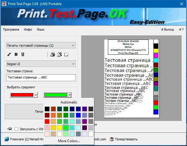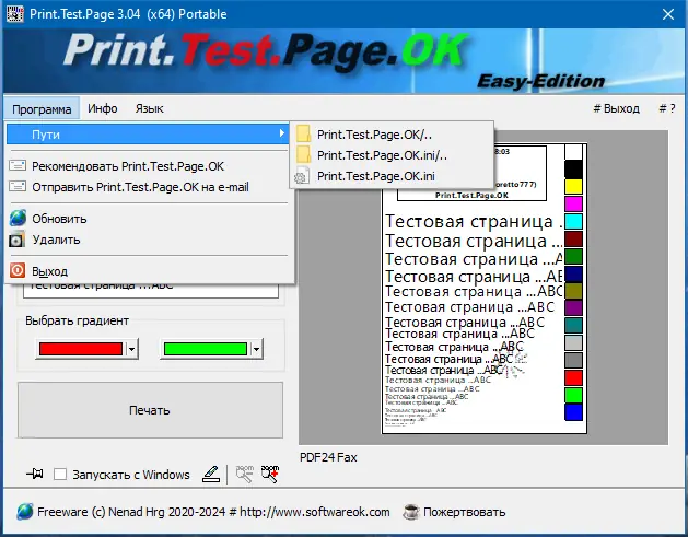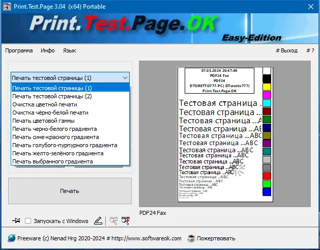 Print.Test.Page.OK — это компактная портативная утилита для тестовой печати, предназначенная для операционных систем Windows 7, 8/8.1, 10 и 11. Она обеспечивает быстрый и удобный способ проверить качество печати на новых или неисправных принтерах без необходимости сложной настройки или специальных знаний. Программа проста в использовании и не требует инсталляции, что позволяет запускать её прямо из любой директории или с флешки.