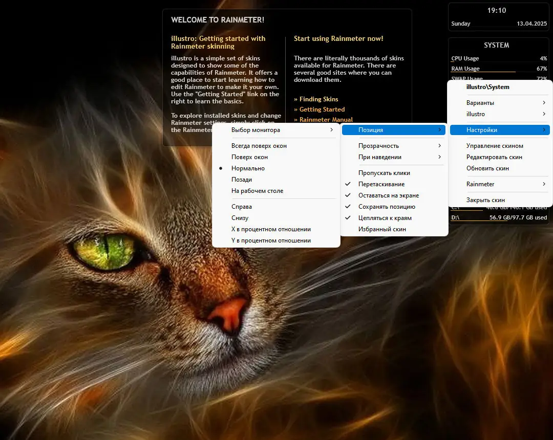 Rainmeter — это мощная и гибкая программа, предназначенная для визуализации данных о работе системы. Она позволяет отображать графики загрузки центрального процессора, количество свободной и занятой памяти (оперативной, виртуальной и дисковой), а также отслеживать сетевую активность, включая IP-адрес, трафик и скорость использования канала по каждому из направлений. Программа также поддерживает отображение новостных лент и прогноза погоды. Одной из особенностей является стиль оформления информации, при котором элементы выглядят как часть рабочего стола, создавая гармоничный и информативный интерфейс.