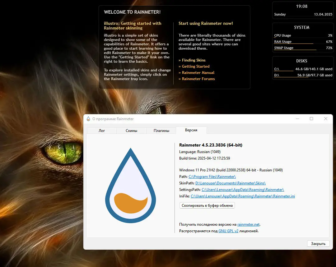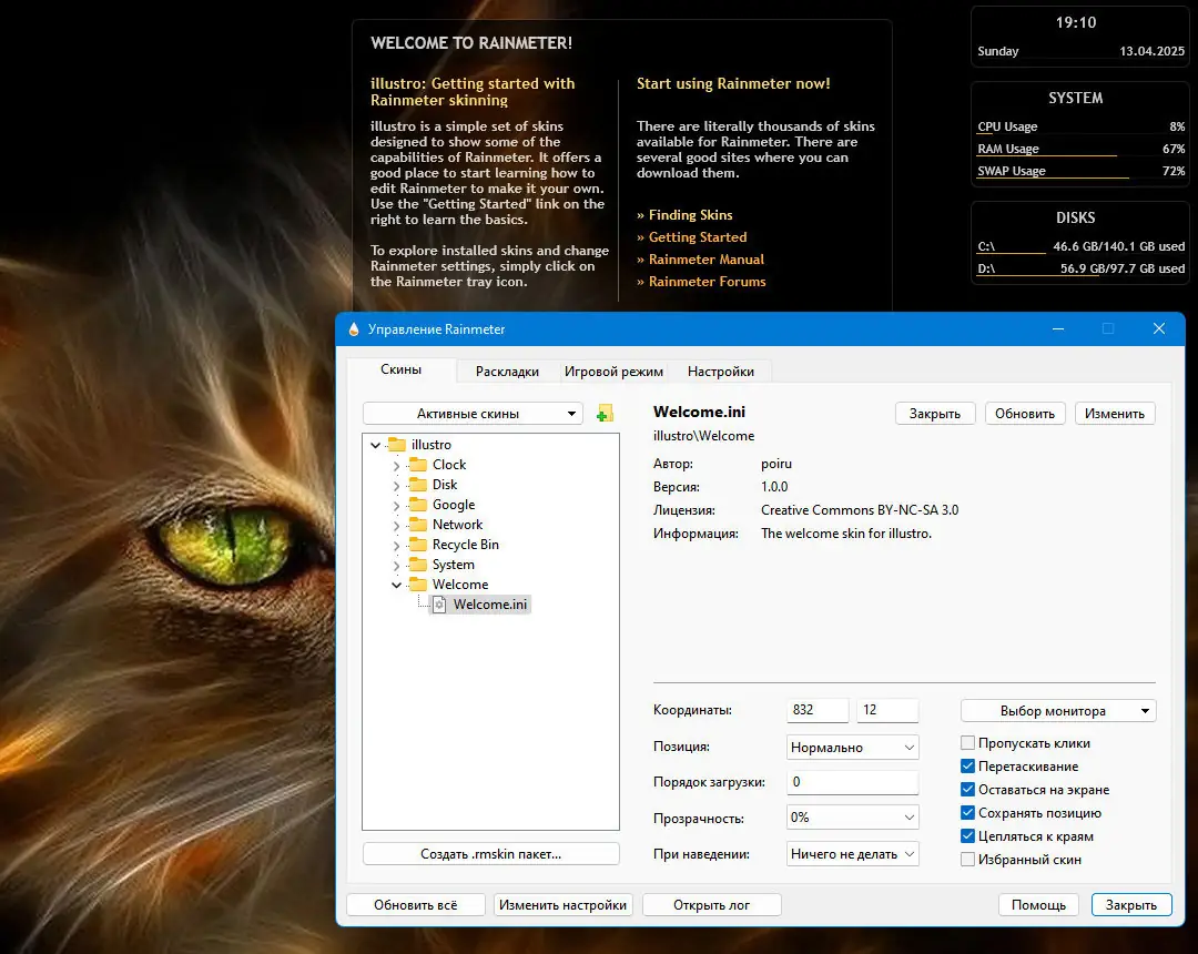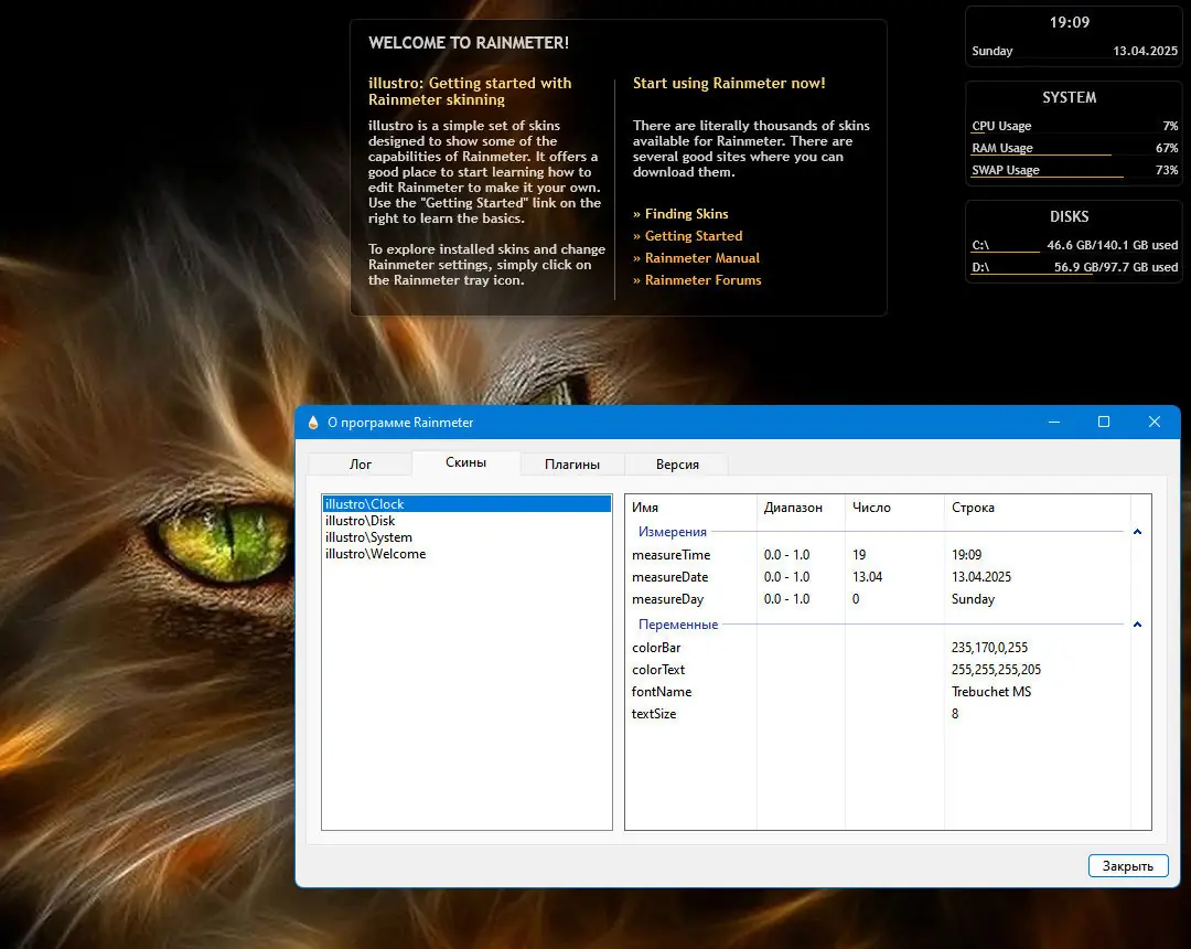 Rainmeter — бесплатная утилита для мониторинга ресурсов компьютера и персонализации рабочего стола. Она позволяет отображать разнообразные информационные компоненты, создавая стильный и информативный интерфейс, который выглядит частью вашей системы.