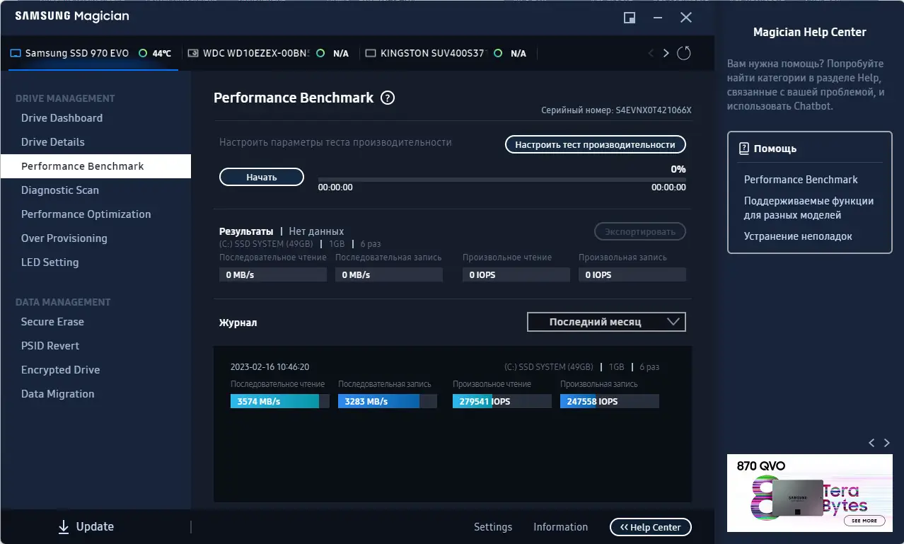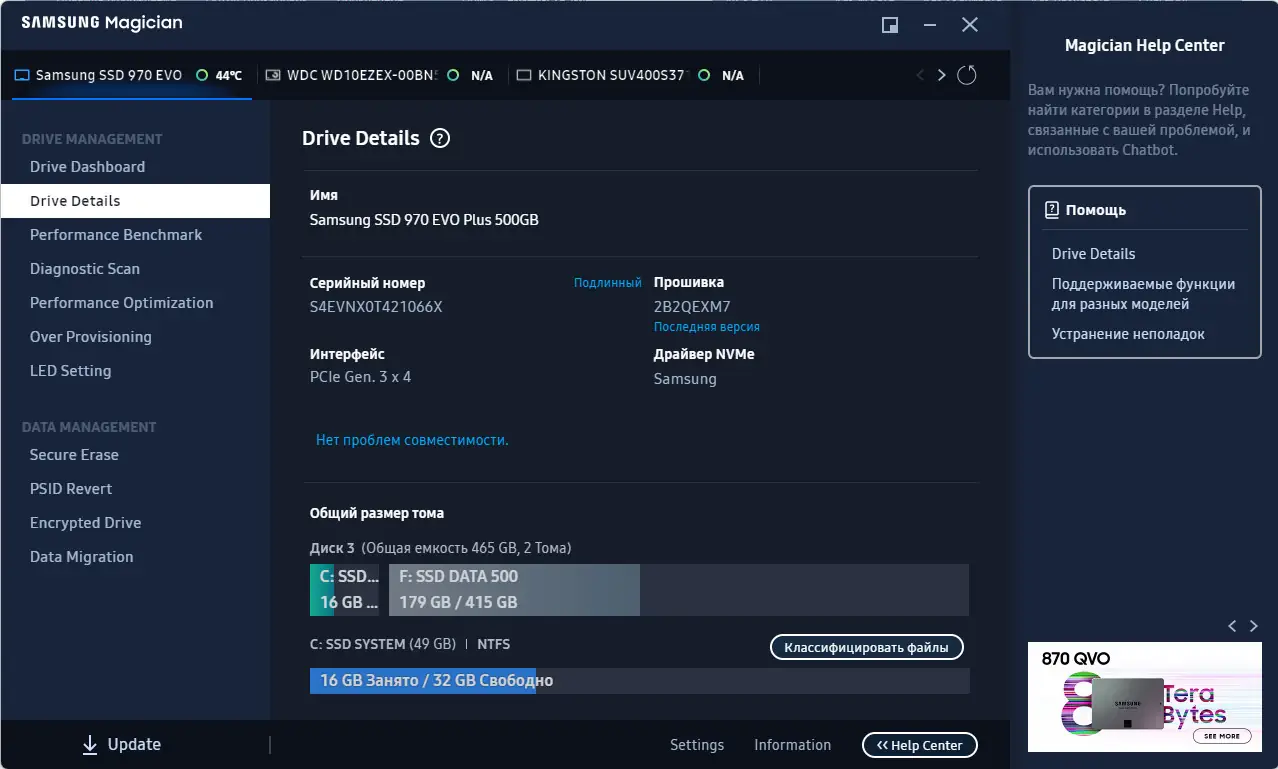Samsung SSD Magician — это многофункциональное приложение, предназначенное для эффективного управления SSD дисками производства Samsung. Программа предоставляет возможность мониторинга состояния дисков, их температуры, скорости чтения и записи, а также осуществляет диагностику и обслуживание накопителей.