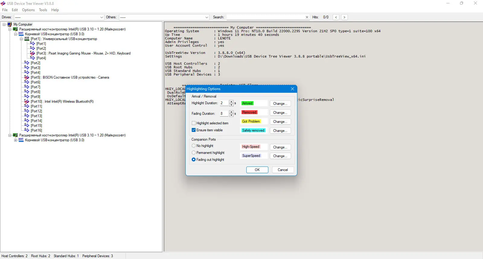 Дополнительные возможности включают асинхронное обновление изменений, отображение дескрипторов в Hex, поддержку XML-отчётов, автоматическое обнаружение новых подключений и удалений устройств, а также интеграцию с реестром Windows для быстрого доступа к настройкам.