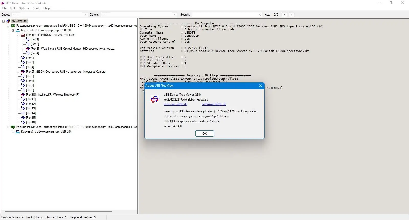 UsbTreeView, основанный на образце от Microsoft «USBView», реализует расширенный просмотр дерева USB-устройств. В отличие от стандартных средств Windows, программа отображает детальную информацию о подключенных устройствах, включая буквы дисков, COM-порты, а также дополнительные параметры, такие как статус безопасного извлечения или перезапуска порта. Похожая на утилиты профессионального уровня, она позволяет копировать текст, обновлять состояние устройств без сброса выбора, а также настраивать шрифты и цвета для правой панели. UsbTreeView поддерживает безопасное удаление устройств с привилегиями администратора, показывает дескрипторы в удобочитаемом формате и предоставляет функционал для быстрого поиска устройств внутри сложных деревообразных структур.