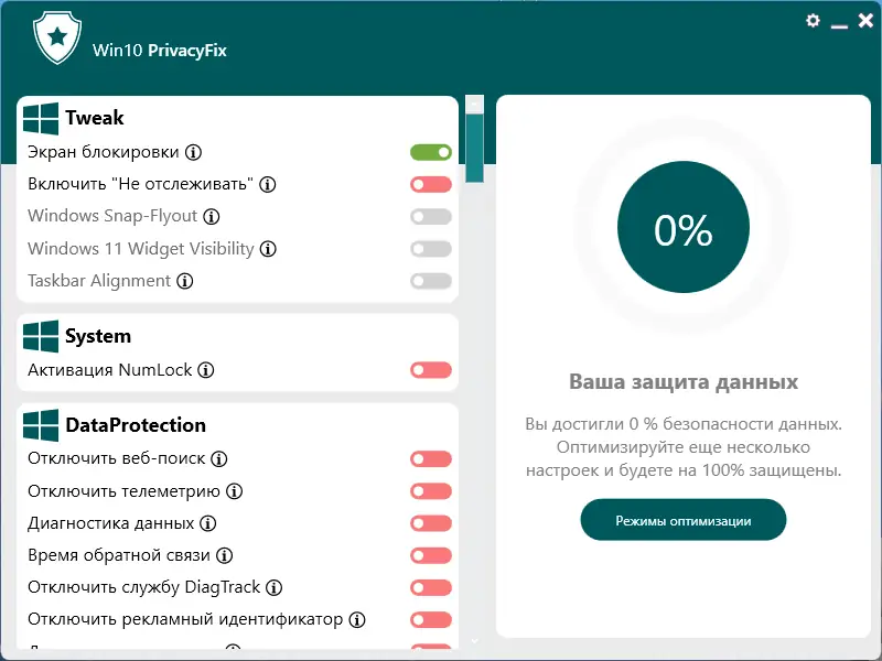 Благодаря простому интерфейсу и множеству настроек, пользователи могут контролировать активность микрофона, передачу записей с клавиатуры и другие функции слежки. Имеется возможность блокировать или активировать отдельные элементы системы в зависимости от пользовательских предпочтений, что делает работу с системой безопасной и комфортной. Кроме того, программа позволяет управлять обновлениями, удалять неподдерживаемые или опасные приложения и выбирать режим оптимизации для конкретных задач.