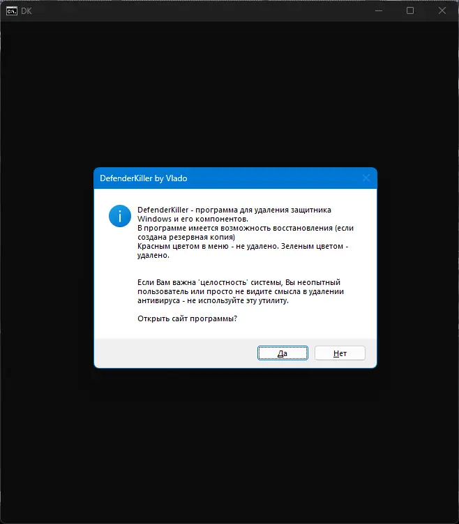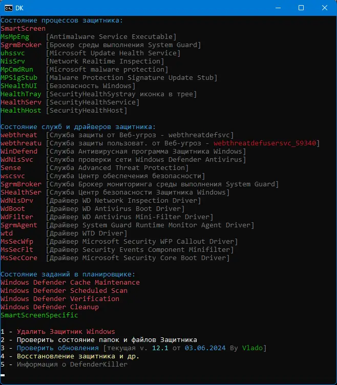 DefenderKiller — это портативная программа, разработанная для быстрого и эффективного удаления или восстановления Защитника Windows на различных версиях операционной системы, начиная с Windows 7 и заканчивая Windows 11. Программа работает без необходимости инсталляции, что делает её удобным инструментом для системных администраторов и опытных пользователей. Обновленная версия 12.1 от 03.06.2024 обеспечивает расширенные возможности и поддержку x32/x64 Bit систем.