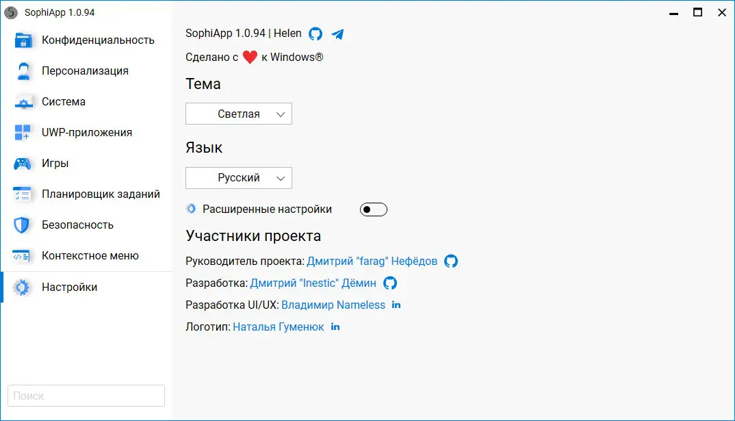 Ищете удобный инструмент для тонкой настройки Windows 10 и Windows 11? SophiApp — это бесплатная, полностью open-source программа, созданная как графический наследник Sophia Script for Windows. Она предоставляет пользователю возможность легко и безопасно управлять настройками системы, не рискуя нарушить её работоспособность. Современный интерфейс, более 130 твиков и демонстрация официальных методов настройки делают SophiApp незаменимым помощником для опытных пользователей и ИТ-специалистов.