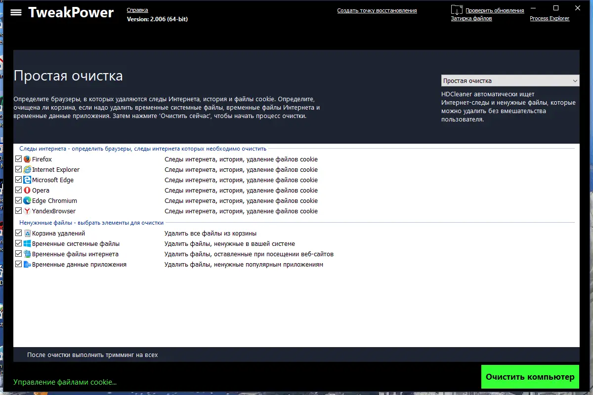 - Очистка мусора, следов посещения интернет страниц и очистка реестра
