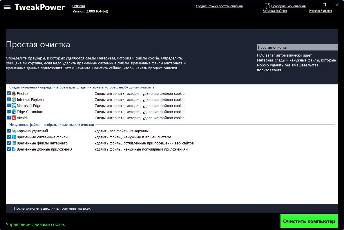 - Очистка мусора, следов посещения интернет страниц и реестра