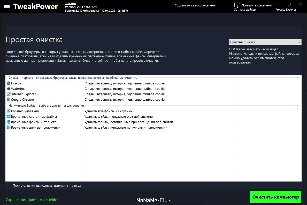 - Очистка мусора, следов посещения интернет-страниц и реестра.