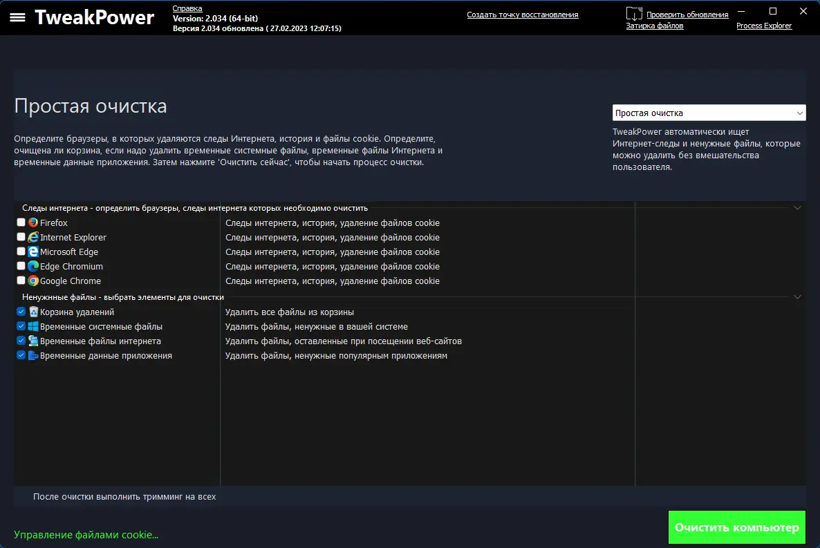 - Очистка мусора, следов посещения интернет-страниц, реестра.