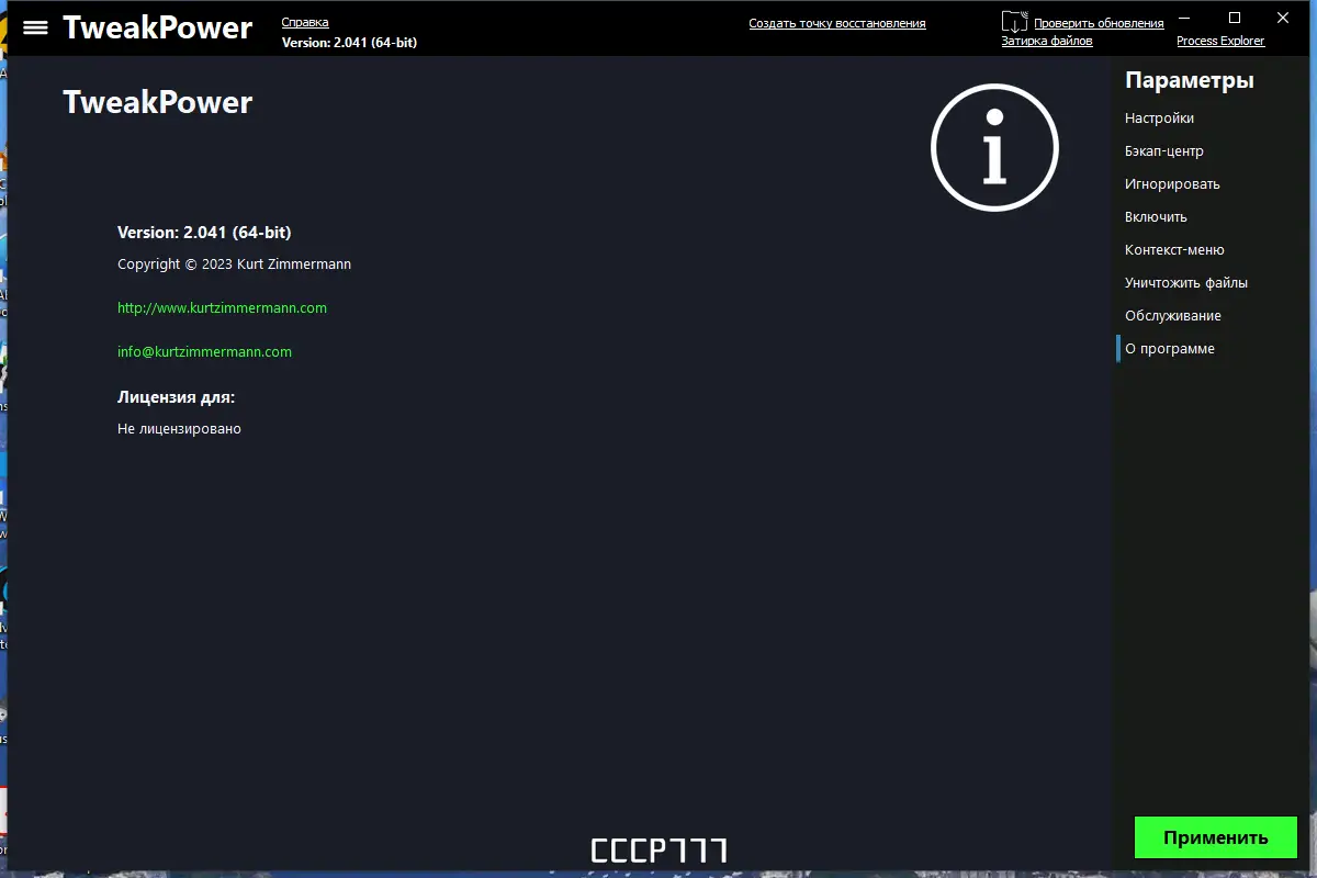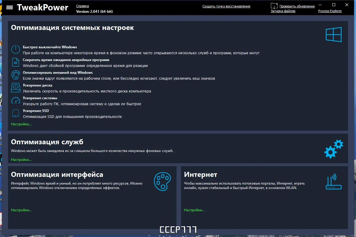 - Создание и восстановление точек восстановления, режим Турбо для отключения фонавыми процессов.