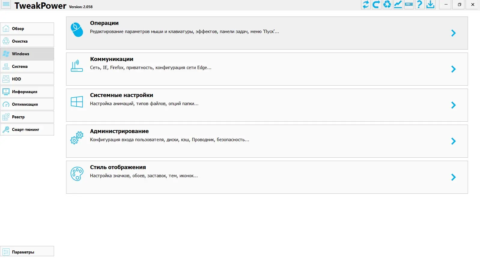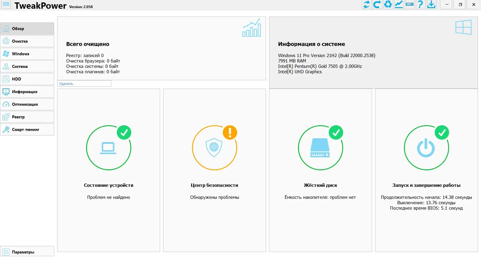 Универсальная программа для оптимизации, очистки и настройки вашего компьютера под управлением Windows. Обеспечивает быстрый доступ к важным инструментам для повышения производительности и безопасности системы.