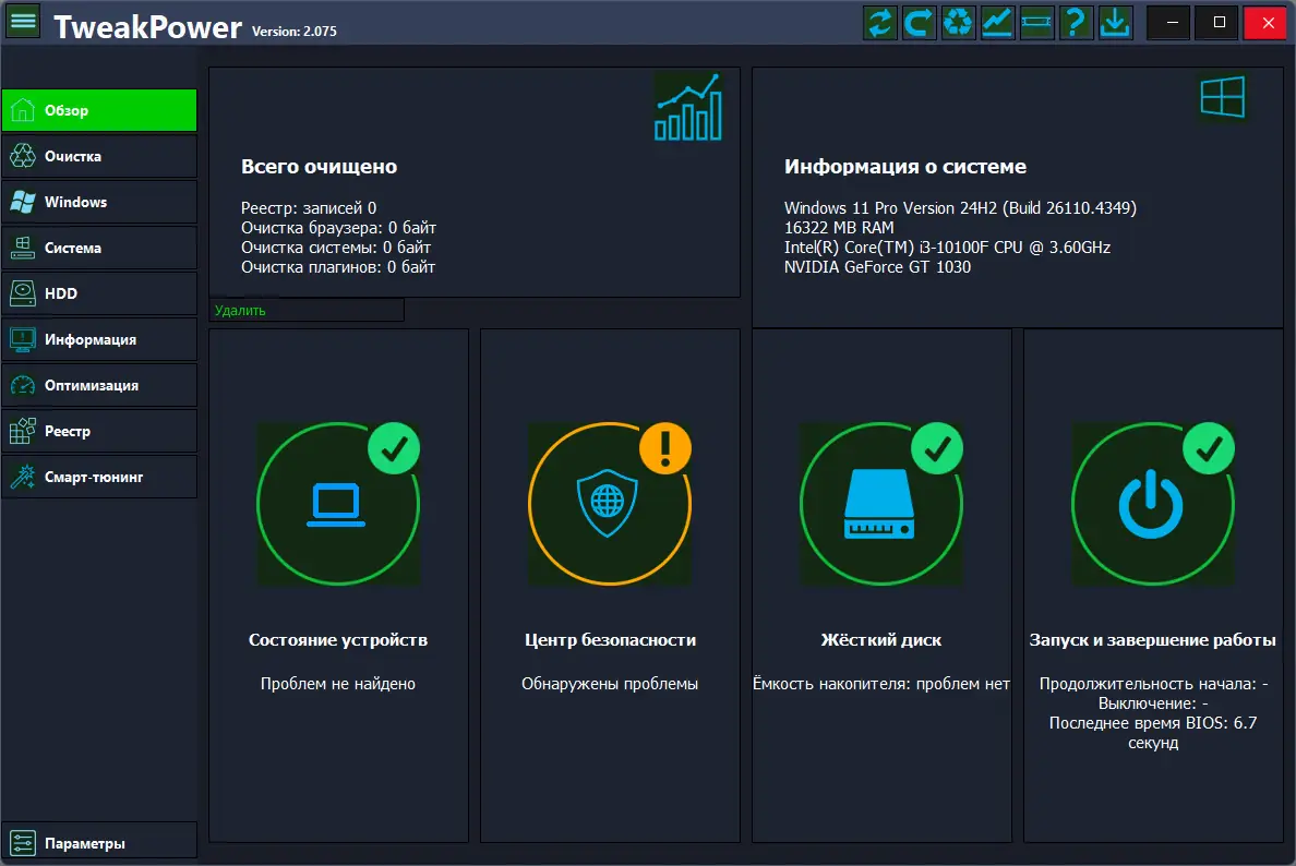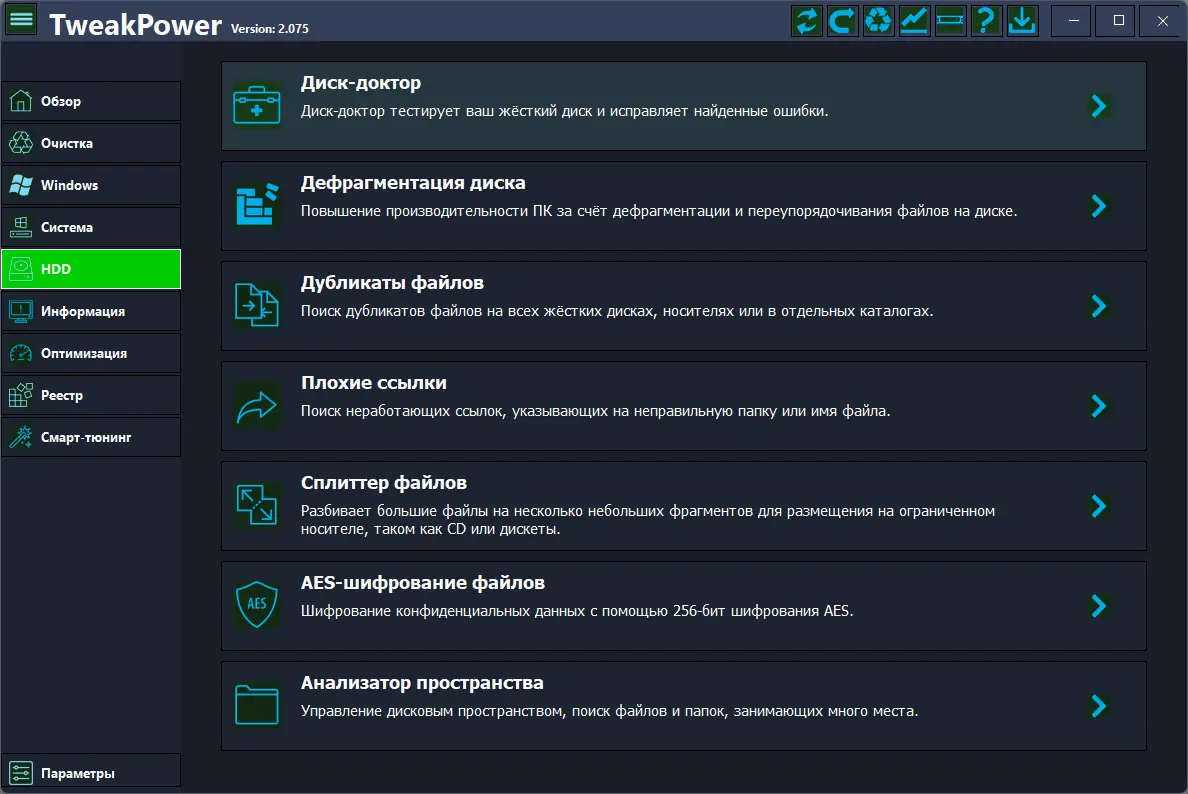 Это мощное программное обеспечение предоставляет единый графический интерфейс, объединяющий множество продвинутых инструментов для улучшения работы компьютера. TweakPower позволяет провести диагностику системы, устранить ошибки, очистить диски, управлять автозапуском и настроить параметры безопасности и конфиденциальности. Благодаря разным режимам работы, пользователи могут индивидуально настроить систему для достижения максимальной производительности и повышенной стабильности, а также выполнить резервное копирование или создать точку восстановления.