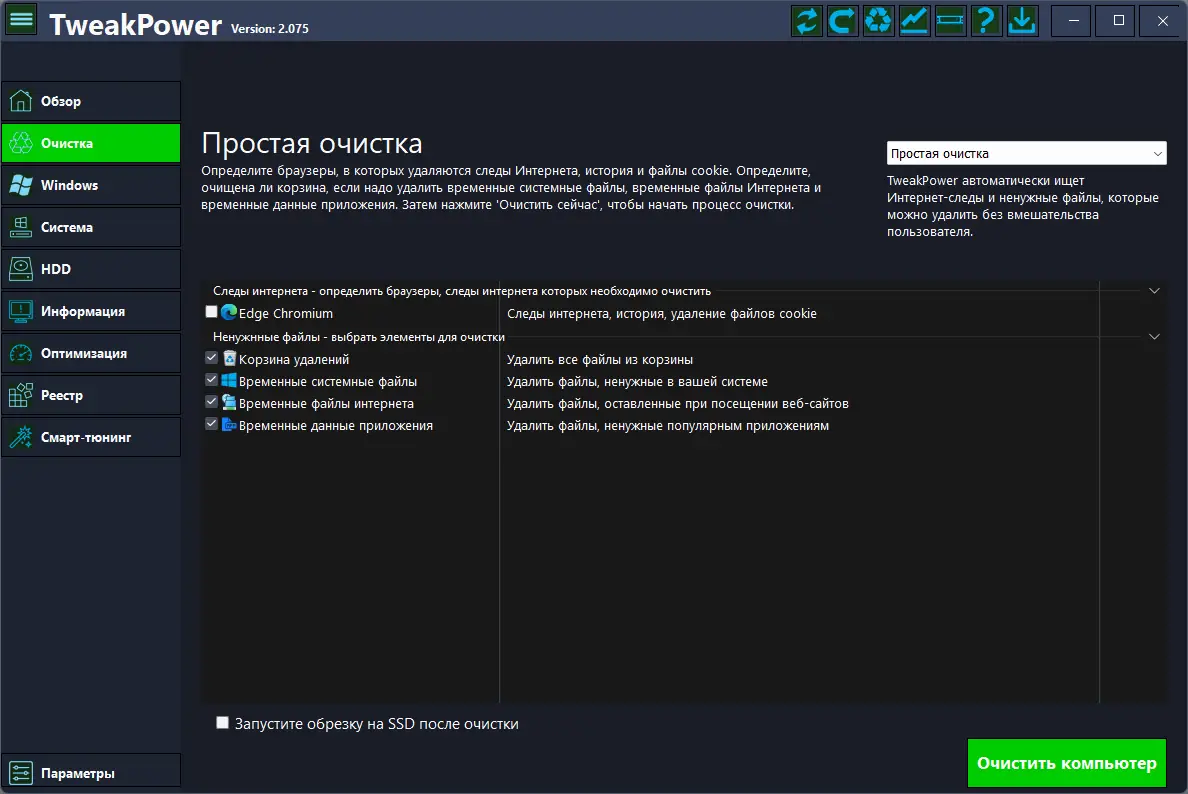 - Очистка мусора, следов посещения интернет страниц и реестра