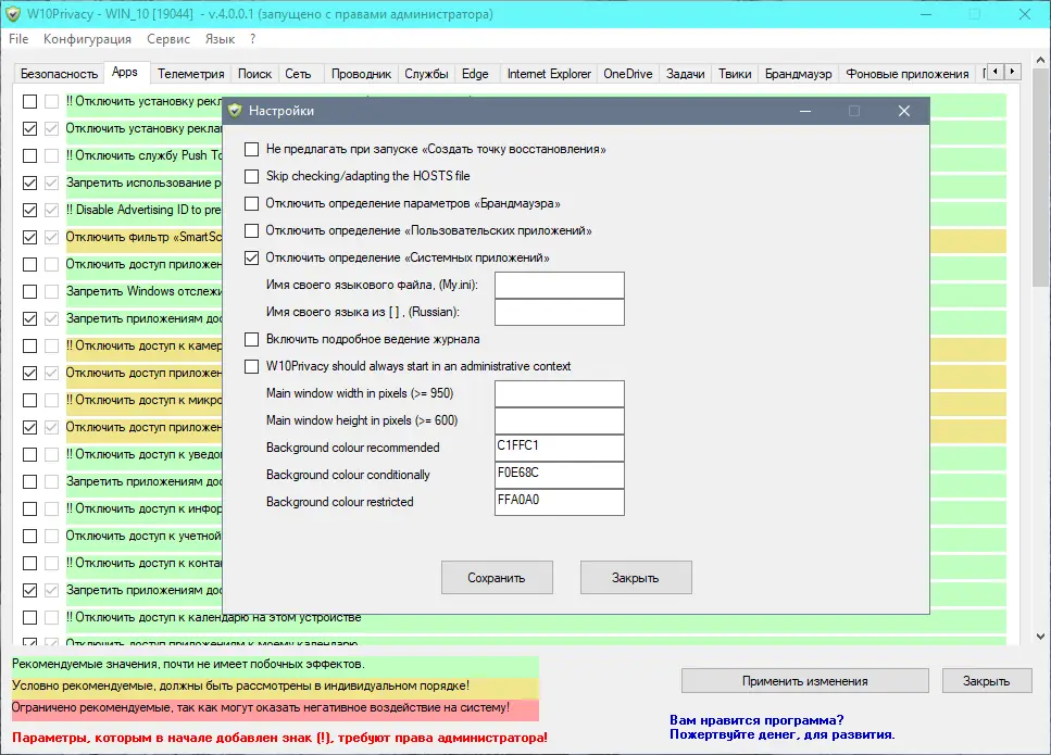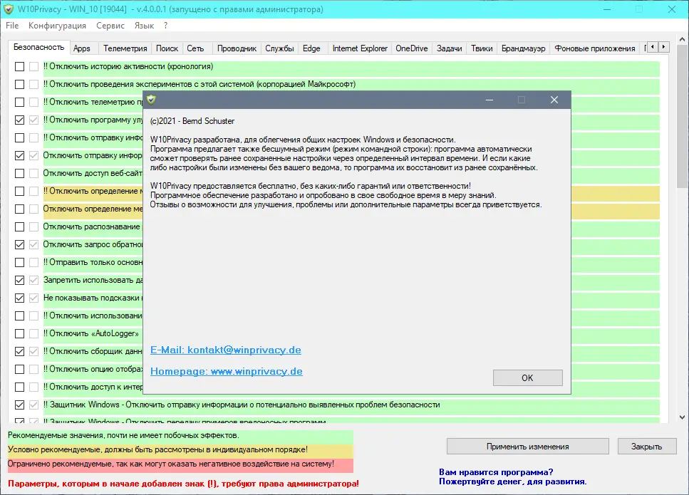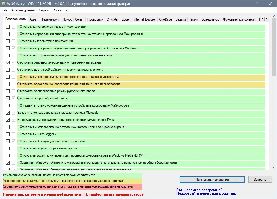 Данная утилита предлагает обширный набор инструментов для изменения настроек системы Windows 10, а также других версий — Windows 7, 8/8.1, 11, и их 32/64 битные варианты. Основная задача — предоставить пользователю возможность самостоятельно управлять уровнями защиты данных и приватности, предотвращая нежелательный сбор информации со стороны системы и приложений. В интерфейсе программы параметры четко разделены на 12 разделов, что облегчает навигацию и выбор нужных настроек. Уникальной особенностью является выделение параметров по цветам и появление подсказок при наведении, что помогает понять возможное влияние на работу системы.