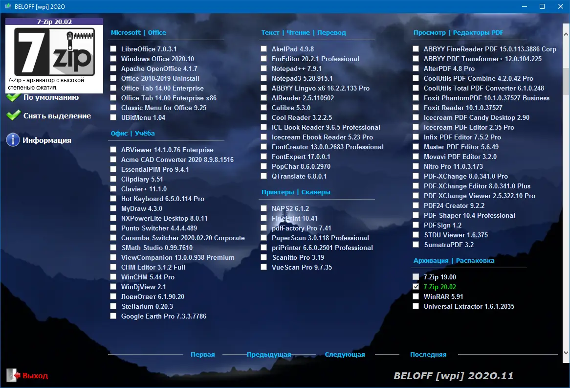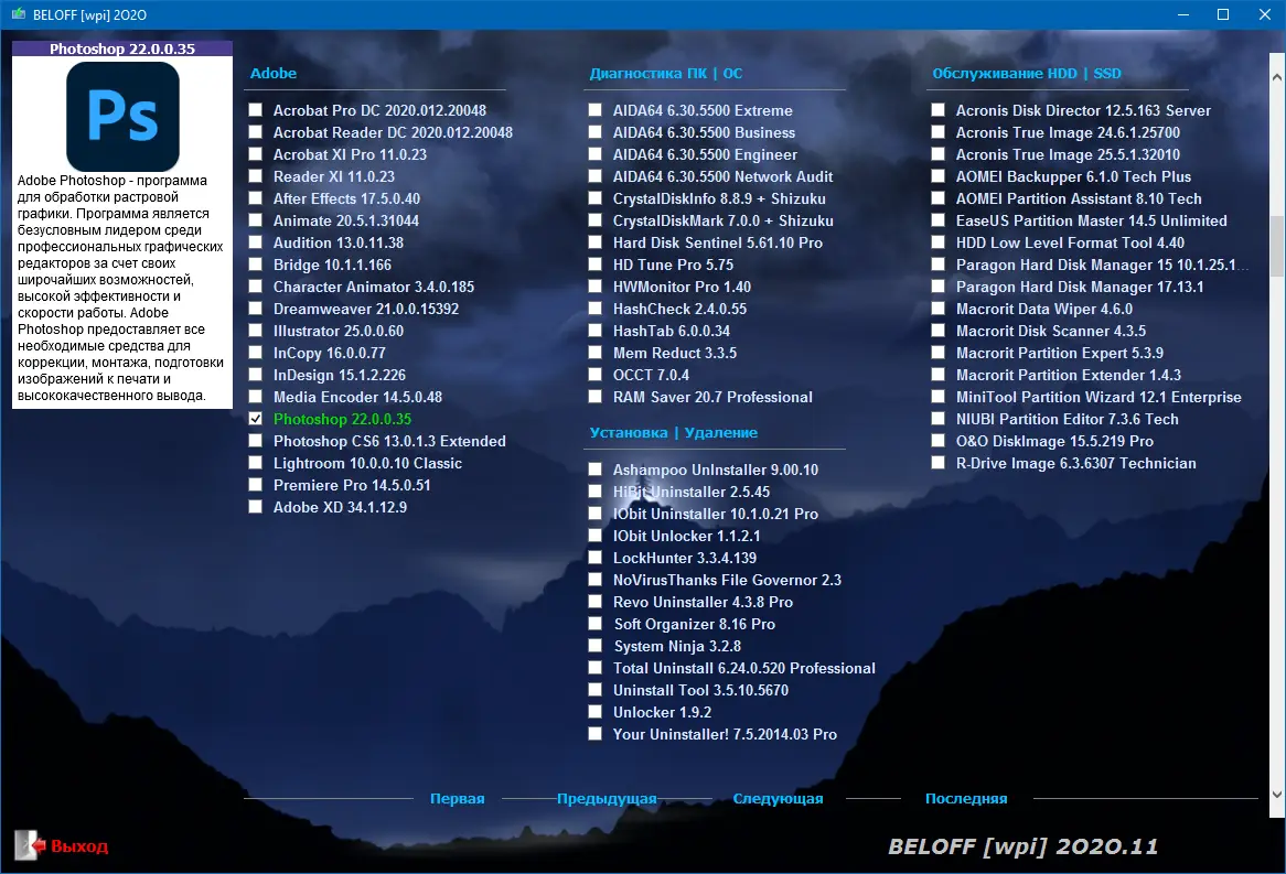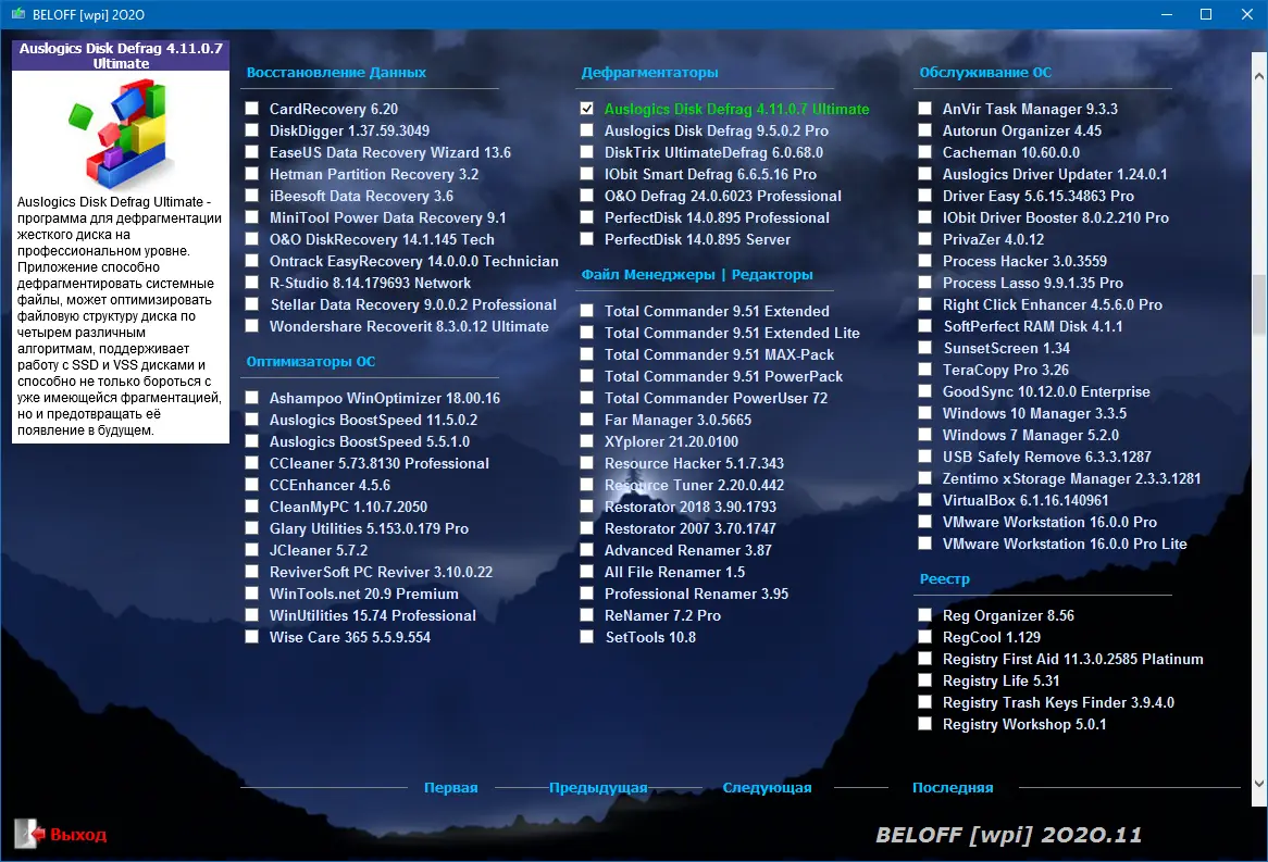 BELOFF — универсальный сборник лучших программ для пользователей всех версий Windows (от Windows 7 до Windows 11). В комплект входит огромное количество программ, распределённых по категориям, с возможностью автоматической установки и портативного использования. В сборнике предусмотрена мультизагрузка, что позволяет легко создавать загрузочные USB-носители с полной коллекцией софта. Используйте сборник для быстрого обновления, настройки и обслуживания системы, а также для поиска нужных инструментов без необходимости поиска по интернету.