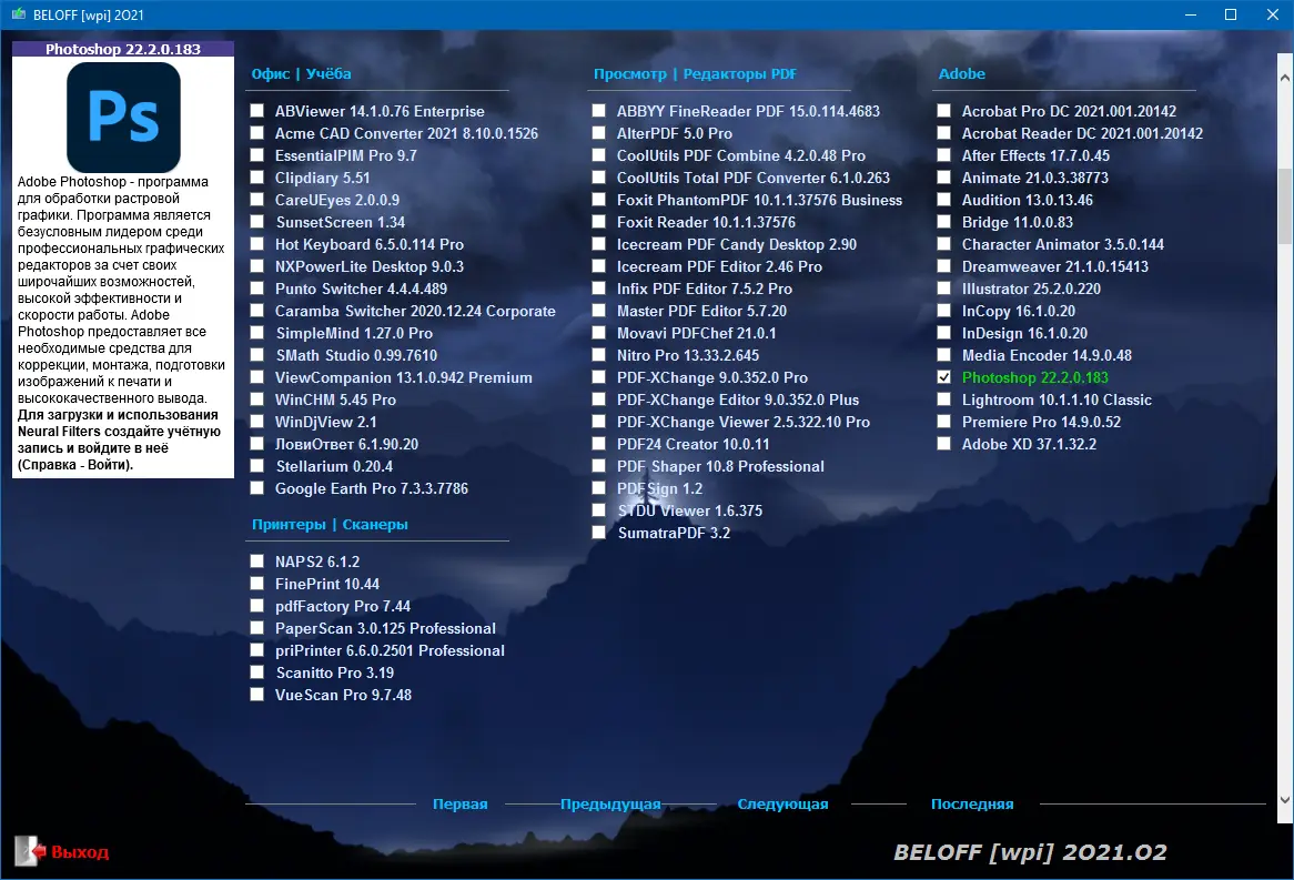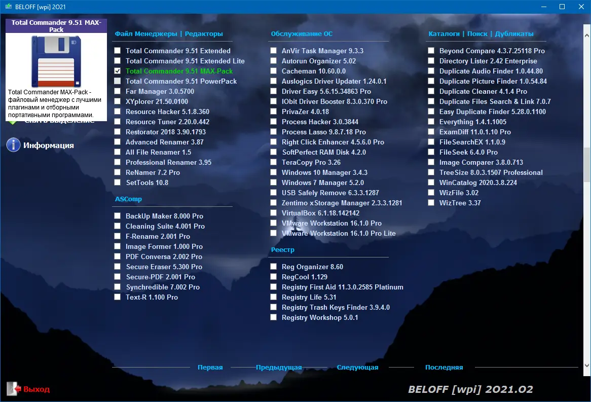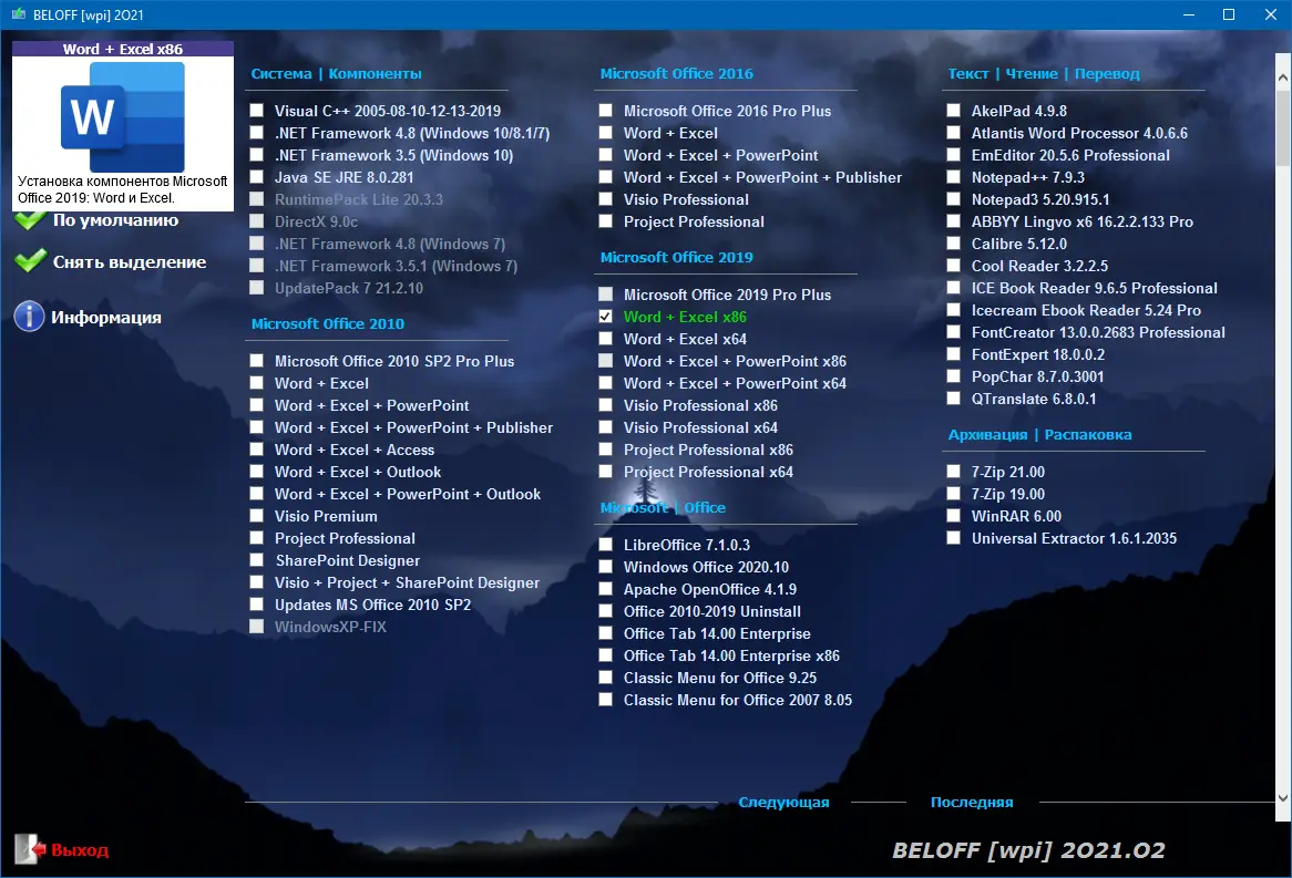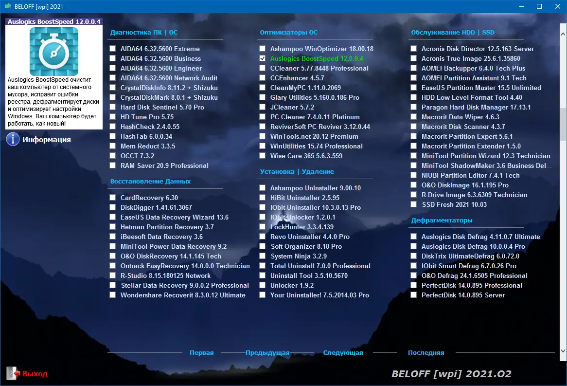 BELOFF — универсальный сборник лучших программ Рунета, предназначенный для автоматической установки и портативного использования на операционных системах Windows. В сборник включены софт различных категорий: офисные редакторы, программы для чтения и редактирования документов, графические редакторы, средства для работы с видео и аудио, утилиты для обслуживания системы и драйверов. Особенностью является мультизагрузка и возможность автоматической установки драйверов с помощью Snappy Driver Installer и DriverPack Solution. Вся программа реализована с удобной автоматической установкой в системные параметры, что значительно ускоряет подготовку рабочего окружения.