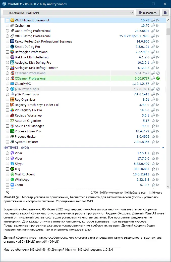 Перед Вами обновленная версия программы MInstAll, созданная для упрощения установки и обновления программного обеспечения на вашем компьютере. Инструмент разработан на основе сборника актуальных программ, зарегистрированных и не требующих активации, что обеспечивает стабильную работу без необходимости дополнительных ключей.
