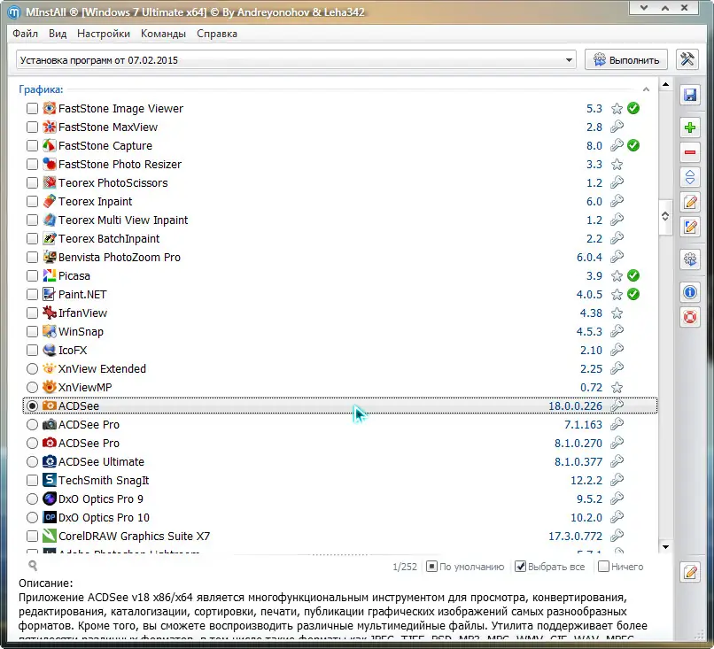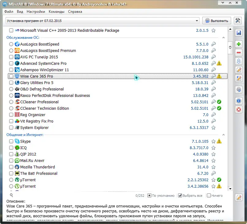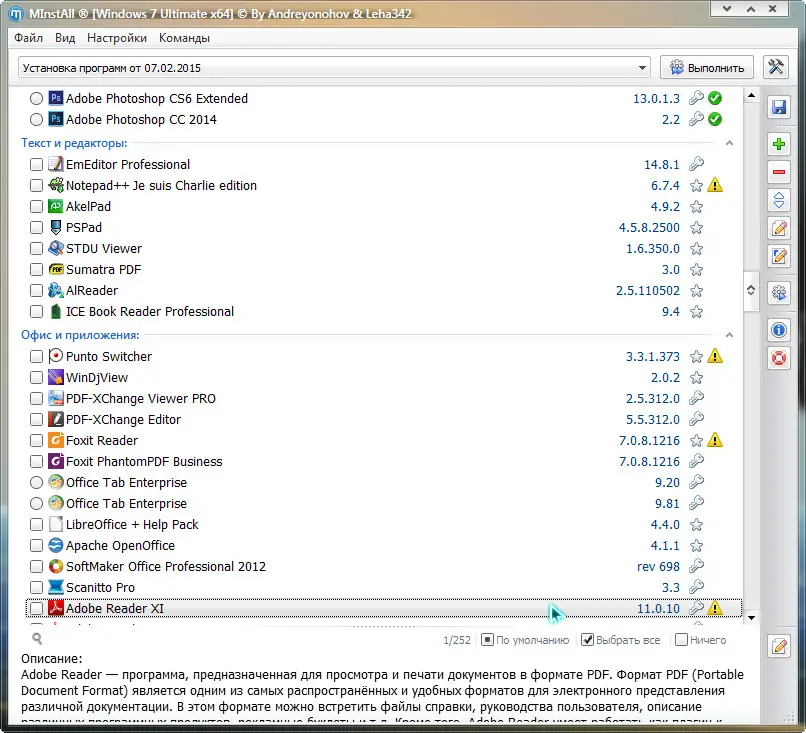 Мастера установки программных обеспечений — это решение для автоматизации процесса установки и настройки большого количества популярных приложений без необходимости ручного взаимодействия. В обновленной версии, вышедшей 7 февраля 2015 года, сборник программ обладает усовершенствованным интерфейсом и расширенными возможностями. В состав входит проверенное на стабильность и безопасность программное обеспечение, которое уже зарегистрировано и не требует активации. Эта сборка идеально подходит для быстрого и удобного комплектования чистых систем, а также для массового удаления или добавления программ.
