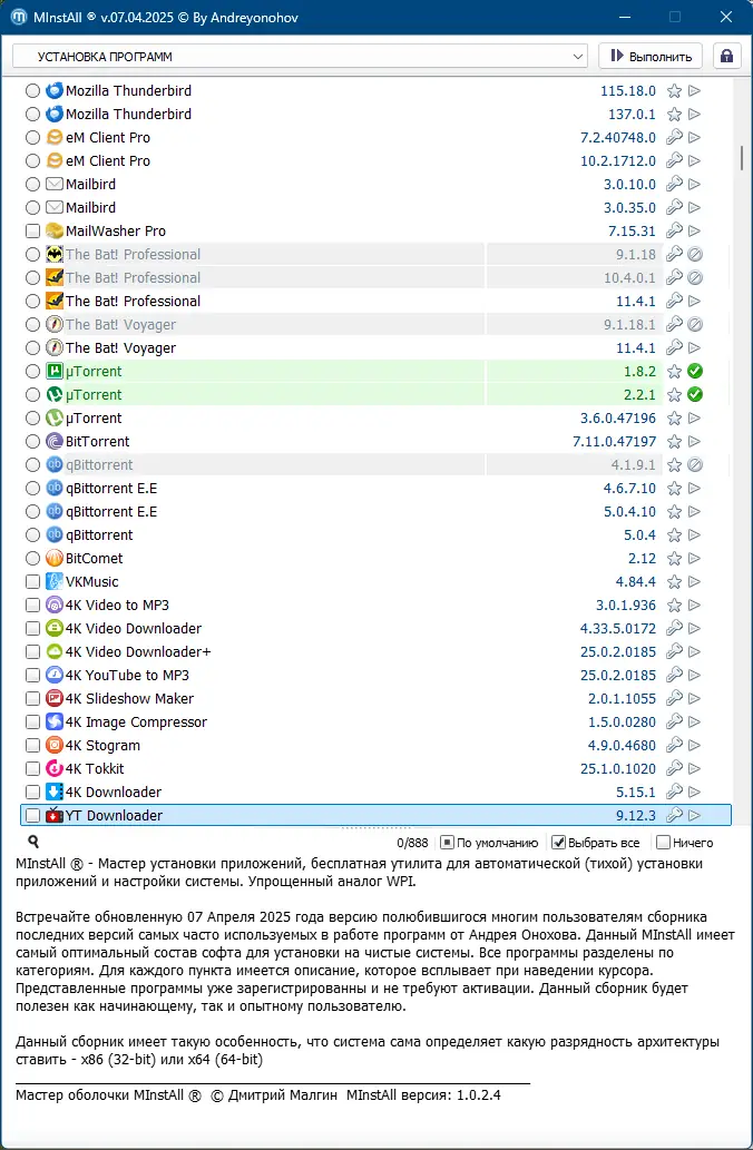 Мощный и удобный сборник программ, предназначенных для автоматической установки, активации и обслуживания операционных систем и офисных приложений. Обновленная версия содержит последние версии популярных программ, адаптированные под архитектуру x32/x64 Bit и совместимые с Windows 7, 8/8.1, 10, 11 и более новыми системами. В комплексе представлены инструменты для быстрого управлением драйверами, системной оптимизацией, интеллектуальным удалением, копированием, архивацией, мультимедийной обработкой и специализированные утилиты для работы с образами, виртуальными машинами и безопасностью системы.