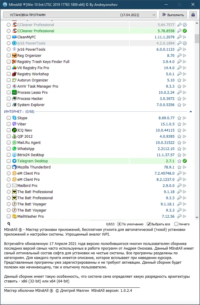 Перед вами обновленный сборник программ от Андрея Онохова, предназначенный для быстрого и удобного установления необходимого программного обеспечения на чистую систему. В новой версии сборника, реализованной в оболочке MInstAll, объединены последние версии популярных приложений, оптимизированных по составу и функциональности, а также упрощённая установка и автоматический выбор архитектуры системы. Весь софт уже зарегистрирован и не требует активации, что значительно ускоряет процесс подготовки системы для работы.